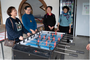 今天,她们暂时放下工作,舒缓心情,淌洋在春光里,展现出温暖而柔和的笑容。她们体验了桌上足球,与同事们并肩而战。每当球儿巧妙地绕过防线、射入对方的球门时,简单的胜利便会使她们的脸上绽放出灿烂的笑容......放下疲惫与压力,尽情享受与同事们共度的欢乐时光。她们的笑声、欢呼声形成了一幅温馨而美好的画面。