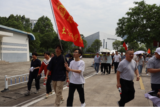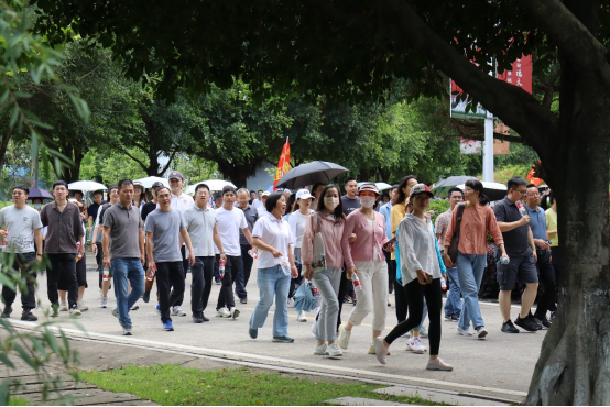 下午两点的校园阳光明媚,沐浴着初夏的阳光,教职工们从第一田径场出发,途径校团委、方境桥、长湾山、行政南楼、火山地质园(梅园)、福友阁、湖边栈道、校友楼、行政北楼、百竹园、雕塑园、同心林等地,最终返回第一田径场。老师们感受着校园的美丽风光,快步前行,一路上充满了轻松愉快的氛围。