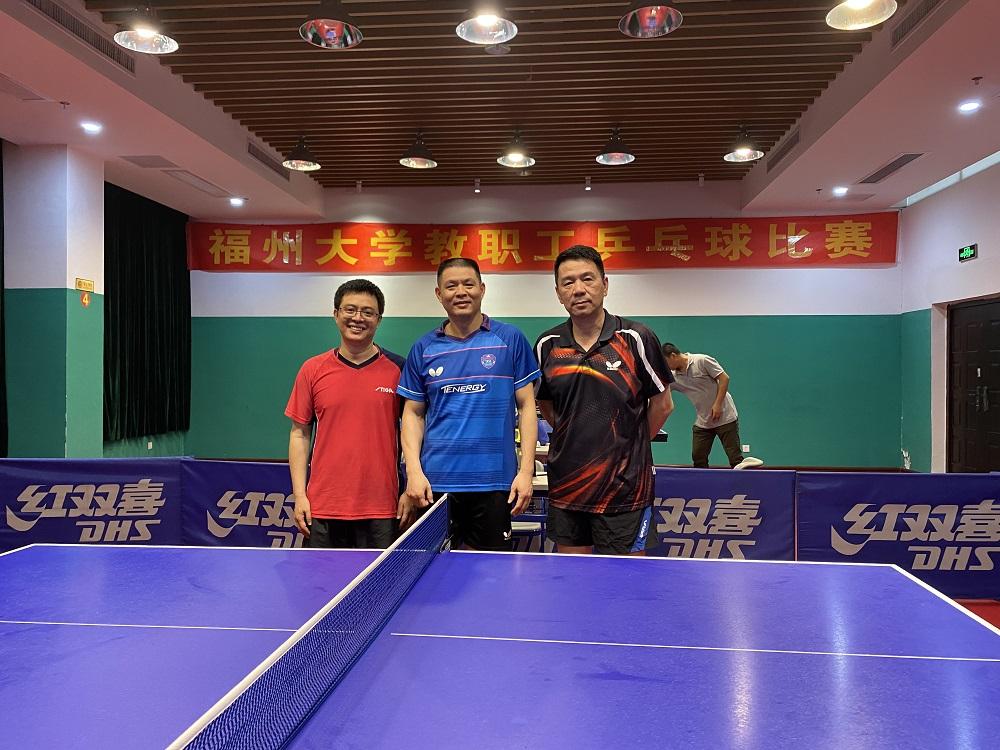在近期校工会举办的2021年教职工乒乓球比赛中,由陈明飞、夏樟华、黄寿泰三位老师组成的土木学院代表队力克群雄,获得了男子团体比赛的冠军!
