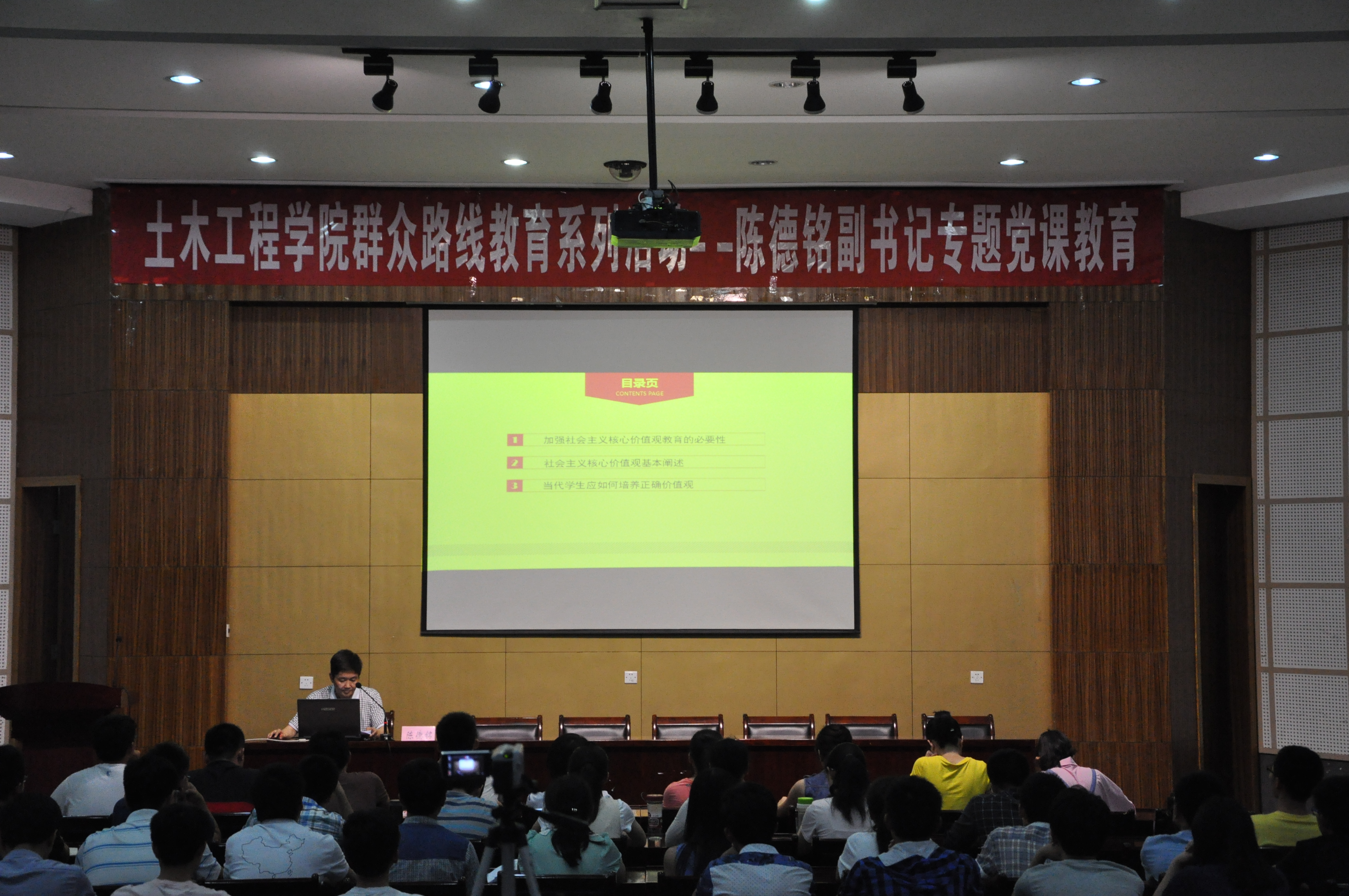 陈德铭副书记从加强社会主义核心价值观教育的必要性、社会主义核心价值观的基本阐述以及当代学生如何培养正确的价值观三个方面出发,结合我们前辈实实在在地践行社会主义核心价值观的案例以及土木专业性质指出培育和践行社会主义核心价值观的重要性。接着,陈德铭老师为当代大学生在学习和切实践行社会主义核心价值观、实现人生价值上提出了四点要求:首先要勤学,知识是树立核心价值观的基础,大学之要,贵在勤奋,贵在钻研, 贵在永恒,要下得苦功夫,求得真学问;第二要修德,德者,本也,要加强道德修养,注重道德实践;第三要明辨,要明辨是非,善于决断,学会思考,善于分析,正确抉择,做到稳重自持,从容自信,坚定自励,以树立正确的世界观,人生观,价值观;第四要笃实,扎扎实实干事,踏踏实实做人。要迈稳步子,夯实根基,抓住大好机遇,把艰苦环境作为磨练学习的机会,一步一个脚印往前走,坚韧不拔,百折不挠,最终走向成功。最后,陈德铭副书记表示,社会主义核心价值观的养成贵在坚持,要由易到难,由近到远,作为当代大学生要努力把核心价值观的要求变成日常行为准则,在时代大潮中建功立业,成就宝贵人生。