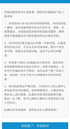 心理测试问卷内容不涉及道德评价、没有对错之分,请本人如实、认真地在手机上作答。测验结果严格按照《中华人民共和国精神卫生法》保密,仅作存档使用,不做为复试考核和确定是否录取的依据。