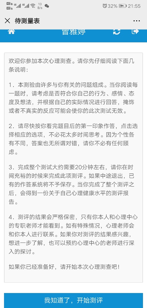 二、登录成功后需要先进行个人信息完善,方可进入测评说明界面,仔细阅读说明后点击开始测评,可见SCL-90及SDS两份待测量表。