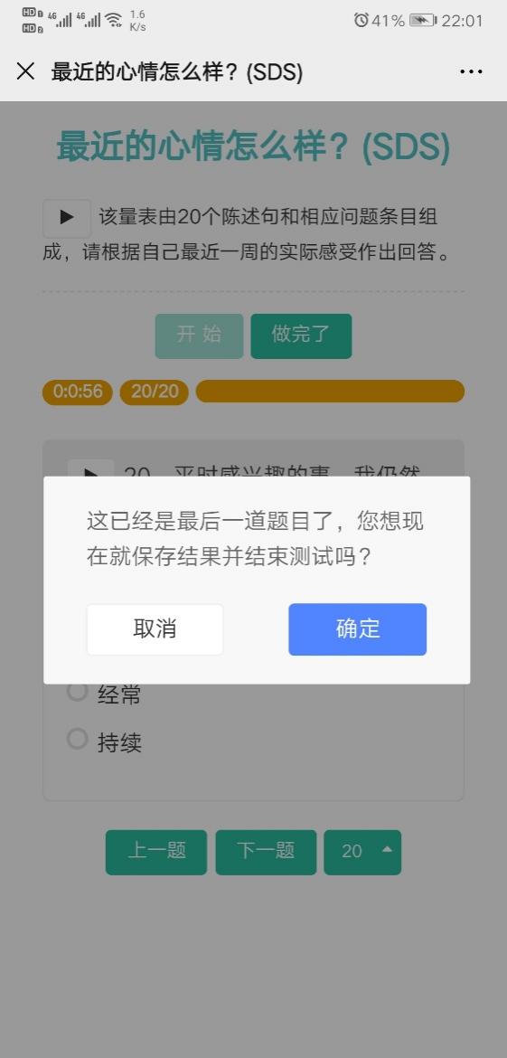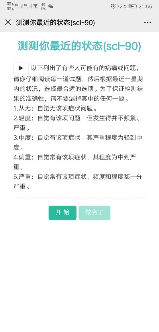 三、点击进入量表跳转测评界面,点击开始,并根据自身情况认真作答每道题目。两份量表均需完成。