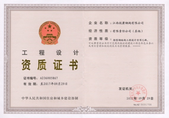 (1)、钢结构专业承包一级资质 (2)、工程设计乙级资质