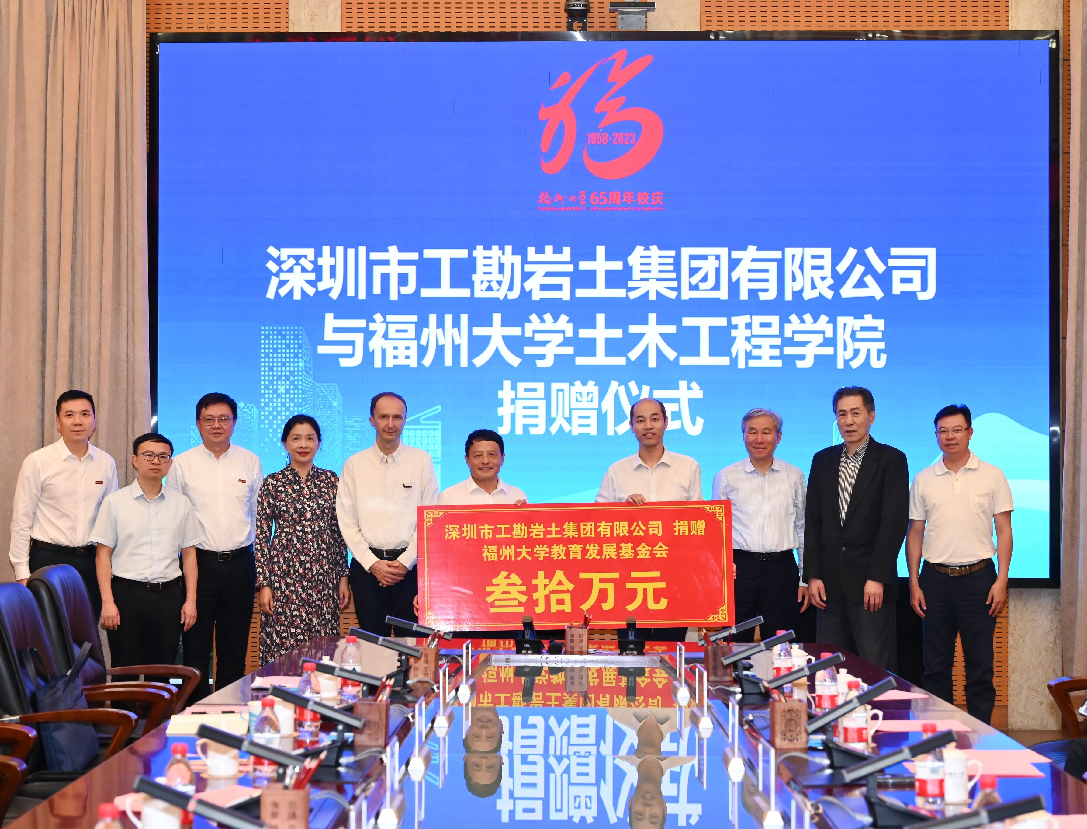 教育事业发展的关心与支持表示衷心的感谢。他指出,陈宜言校友在自身发展的同时,心系母校,热心母校教育事业,彰显着优秀企业家、福大人的责任和担当,传承和发扬了福大精神。深圳市工勘岩土集团有限公司作为行业中的佼佼者慷慨支持学校发展建设,热心公益事业,为社会的进步和发展做出了贡献。今后学校将继续凝聚校友、企业的力量,助力新一轮“双一流”建设。