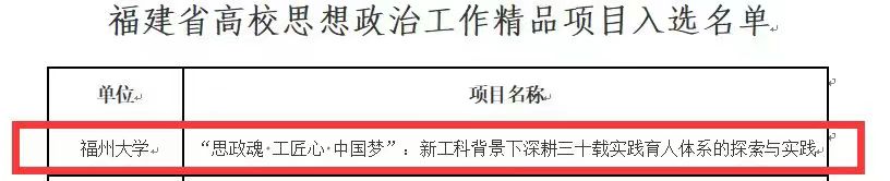 近日,中共福建省委教育工委公布2023年福建省高校思想政治工作质量提升综合改革与精品建设项目入选名单,绅士漫画 实践育人项目《“思政魂 工匠心 中国梦”:新工科背景下深耕三十载实践育人体系的探索与实践》获批福建省高校思想政治工作精品项目,并被推荐参评教育部2024年高校思想政治工作质量提升综合改革与精品建设项目。