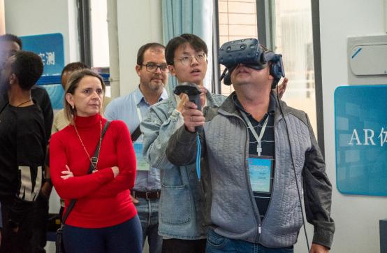 合影留念后,培训班的学员们首先参观了土木工程智慧建造中心。该中心始建于2016年,包括BIM中心、智慧工地实训室、土木工程沉浸式CAVE展厅三个模块,综合采用BIM、VR、物联网等信息技术对房屋、桥梁、隧道等土木工程结构的设计、建造和管理进行模拟仿真,围绕工程全生命周期管理开展实验教学,提高土木专业学生的专业基础和综合能力。学员们对智慧建造中心陈列的装配式建筑施工虚拟仿真系统表现出了浓厚的兴趣,并踊跃试戴VR眼镜进行实际操作,进一步加深了他们对中国土木工程智慧建造技术的认识。