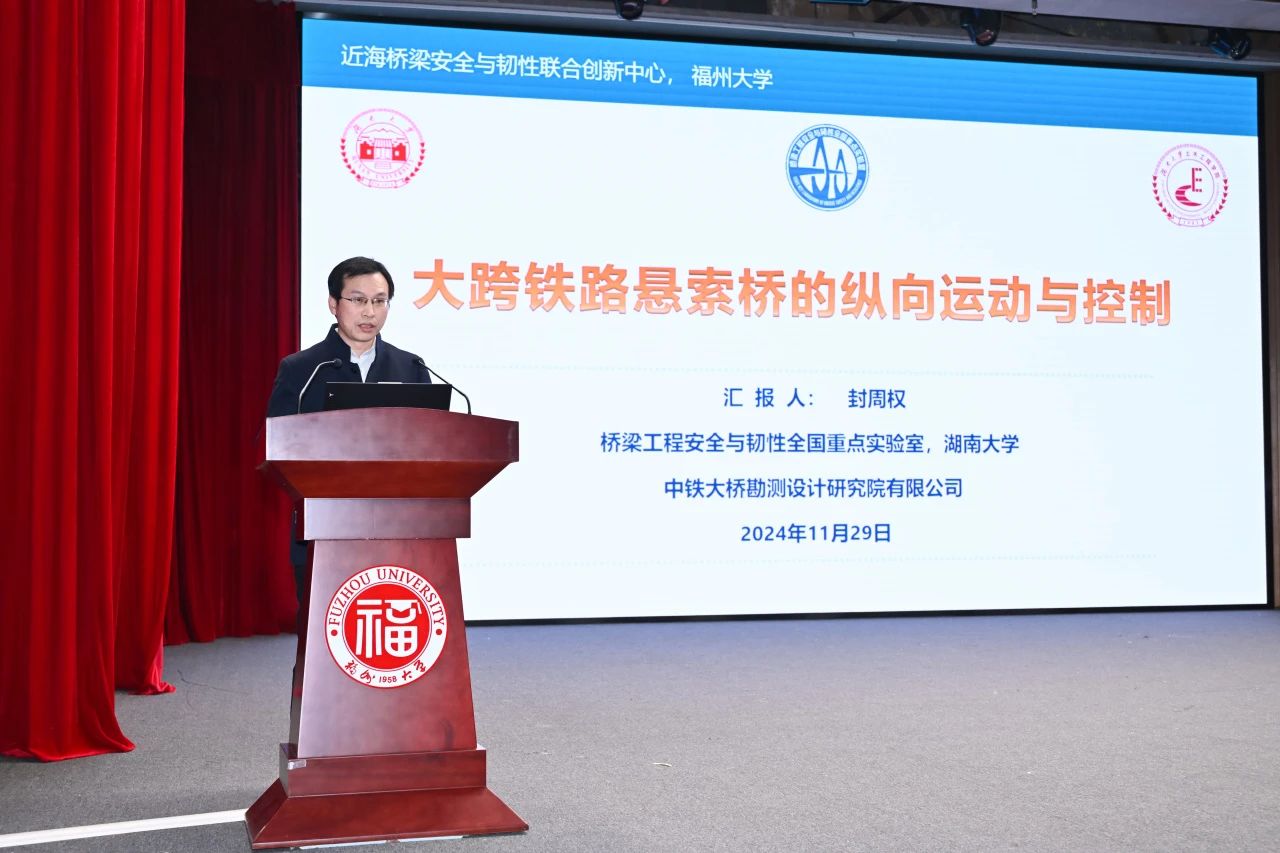 随后,韩强教授、耿波研究员、封周权教授分别进行了主题为《中高烈度区装配双柱式桥墩新体系及其抗震性能研究》《桥梁安全与韧性全国重点实验室运行情况介绍》《大跨铁路悬索桥的纵向运动与控制》的特邀报告。最后,近海桥梁创新中心主任赖志超教授详细介绍了创新中心的建设基础、组织构架及发展规划。