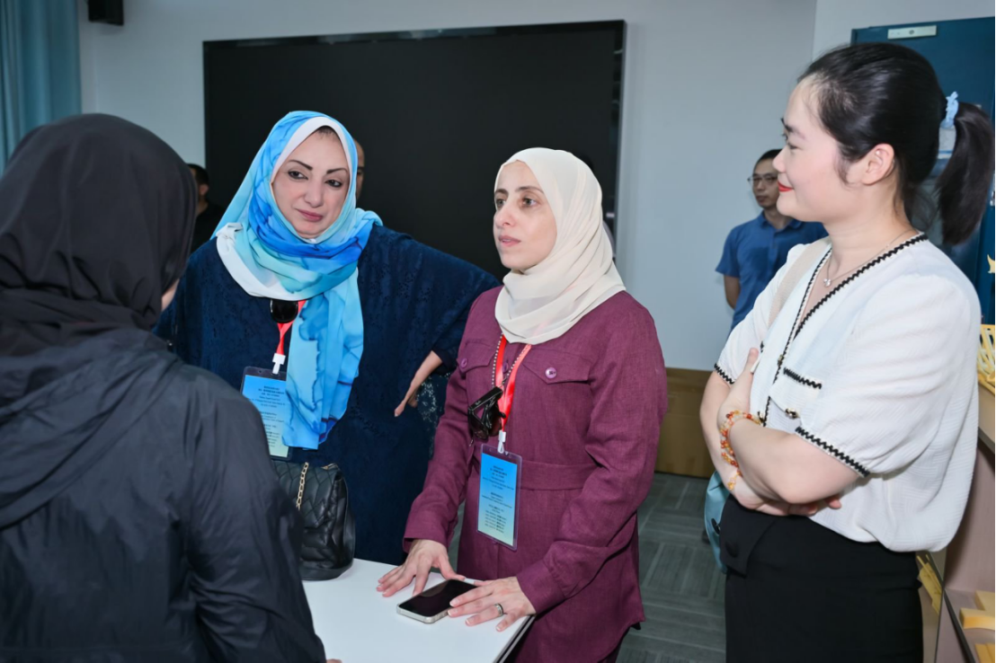 首站,学员们走进了道路工程材料实验室,重点聚焦沥青材料制备与性能测试区域。徐松研究员系统介绍了实验室的整体布局与研究方向,随后逐一展示了完备的沥青材料研发设备,从基础的沥青制样装置到高精度的检测仪器,涵盖动态剪切流变仪、弯曲梁流变仪、压力老化容器、凝胶渗透色谱仪,再到30kN万能材料试验机(UTM)等多台套贵重仪器。这些设备形成了完整的检测链条,既能按照中国国家标准,也能依据美国 SHRP(战略公路研究计划)体系,对沥青材料的高温稳定性、低温抗裂性、抗老化性能等关键指标进行全面评估。随后,双方围绕各自在道路改性沥青的组分优化(如SBS 改性剂的掺量配比)、特殊气候条件下的试验方法以及性能评估标准等方面展开了深入探讨。学员们分享了约旦在道路材料设计与施工中遇到的实际难题,实验室团队则分享了现有的解决方案,现场交流气氛热烈而务实。