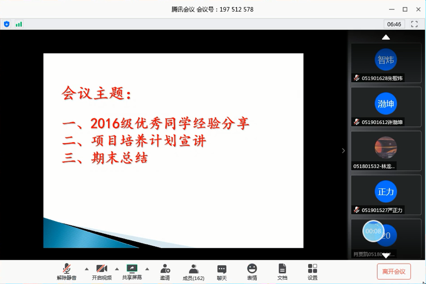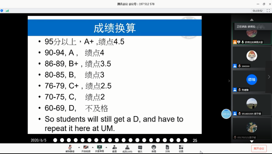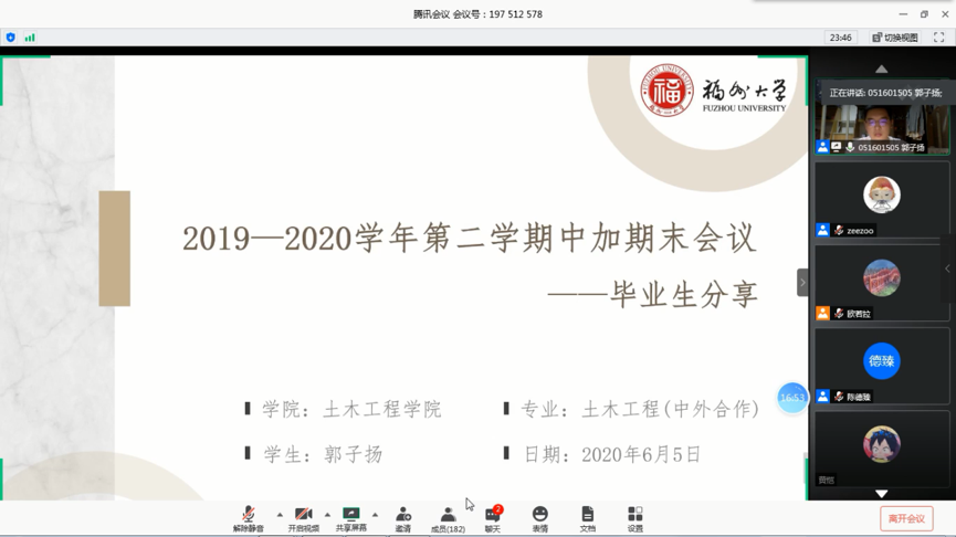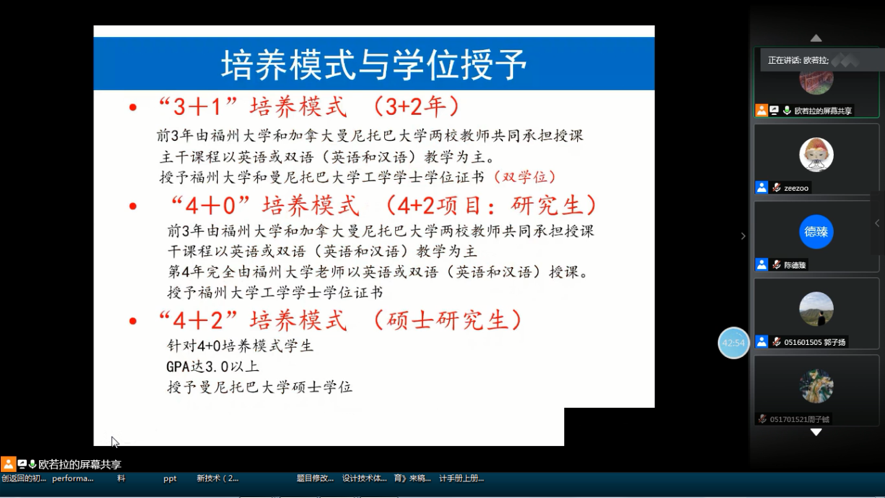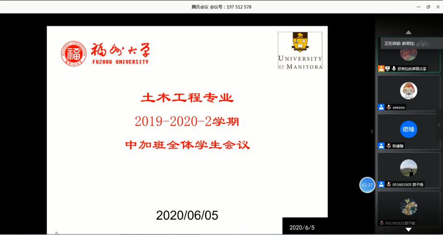 通过“腾讯会议”召开了土木工程专业中加班全体学生线上会议。参加人员有院长助理黄冀卓教授,土木工程专业中外合作项目(中加班)负责人杨艳老师,学院团委副书记兼2018级辅导员江小敏,2017级辅导员沈成平以及中加班4个年级的全体同学。