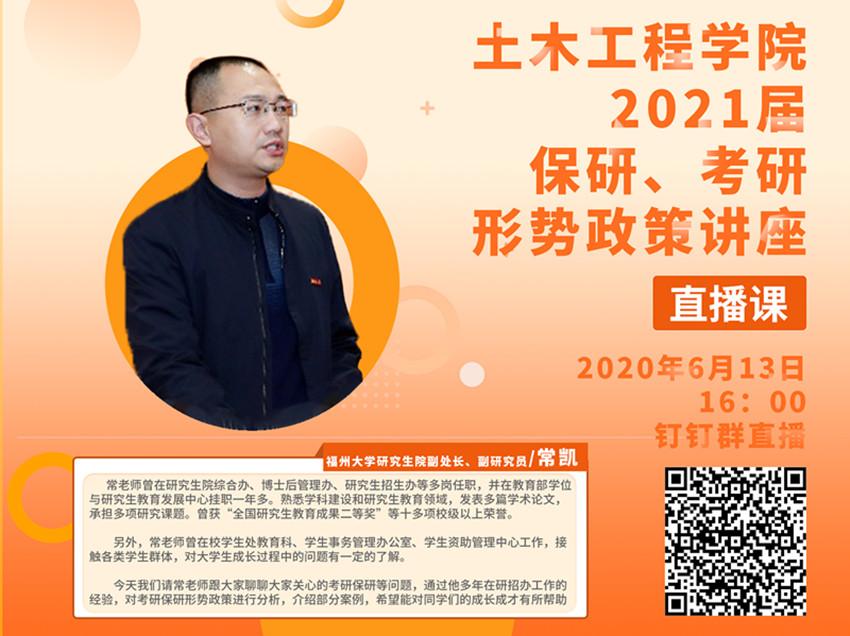受疫情影响,原计划安排在线下举办的讲座转为线上的形式开展。常凯副处长分享他在研招办工作多年的经验,从“了解‘研究生’”、“为何考研”、“如何准备”、“热点问题及注意事项”等四个方面做了较为详细的解析。既有政策解读,又有形势研判;既有数据比对,又有详实案例。从多方位、多角度进行讲解,并就学生关心、关注的问题和需要注意的事项做了说明。最后,他希望同学们做到“确定目标、全盘计划、寻找方法、不懈努力、摆正心态”。
