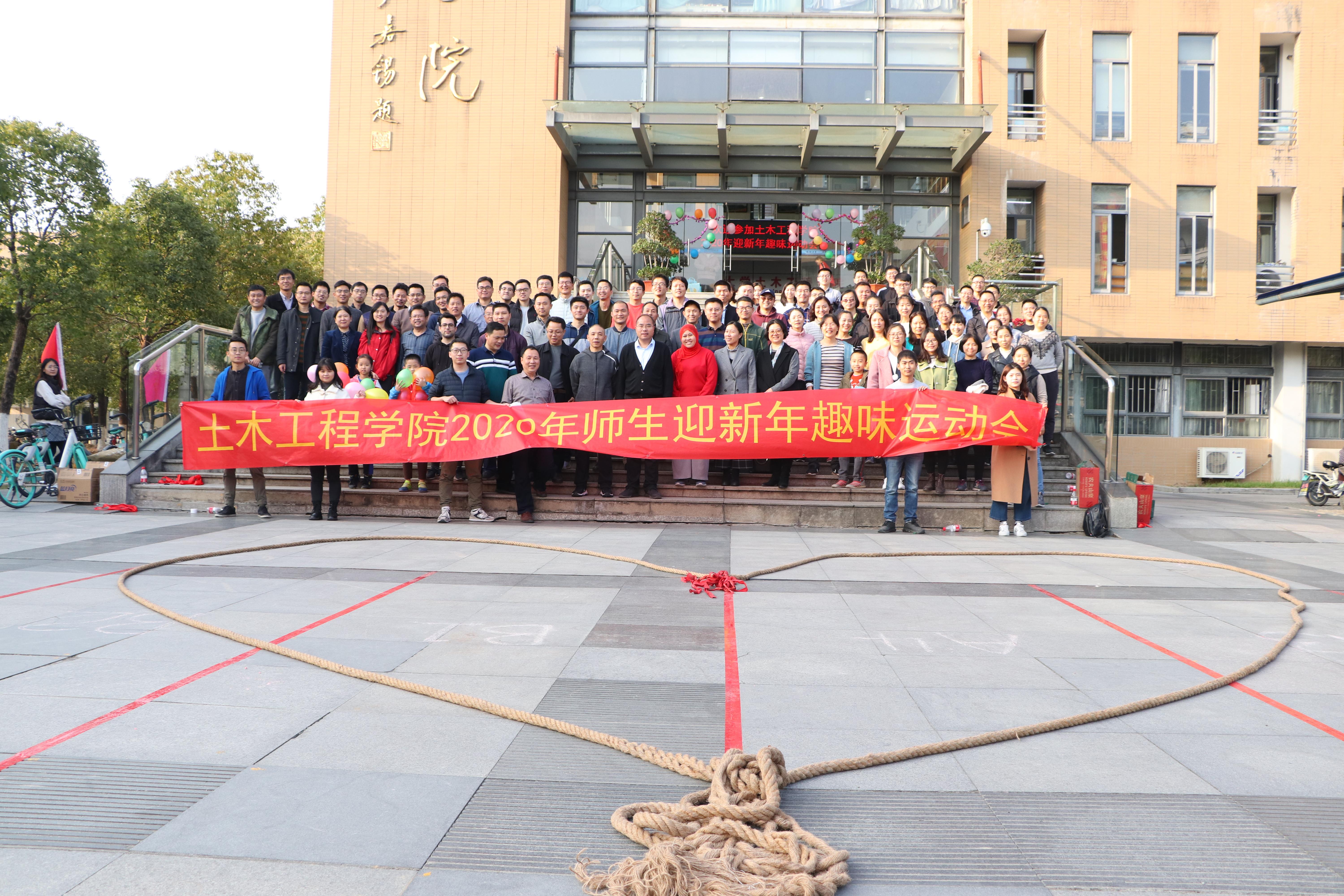 于2020年1月9日下午在学院广场举办2020年师生迎新年趣味运动会。学院党委书记黄培明、院长布鲁诺、副院长胡昌斌、党委副书记余飞、副院长邓涛、工会主席黄利频等领导,以及广大师生和留学生代表等共一百余人参加了此次活动。