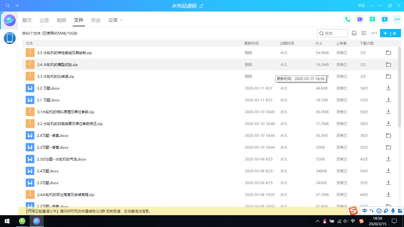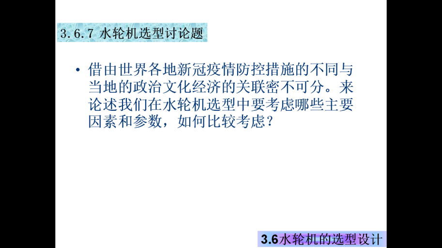 田秀兰老师在《水电站》的线上课程教学中,采用中国MOOC和QQ群直播相结合,引入“人类命运共同体”价值理念,借由世界各地新冠疫情防控措施的不同与当地的政治文化经济的关联密不可分,来论述在水轮机选型中要考虑哪些主要因素和参数,如何比较考虑?