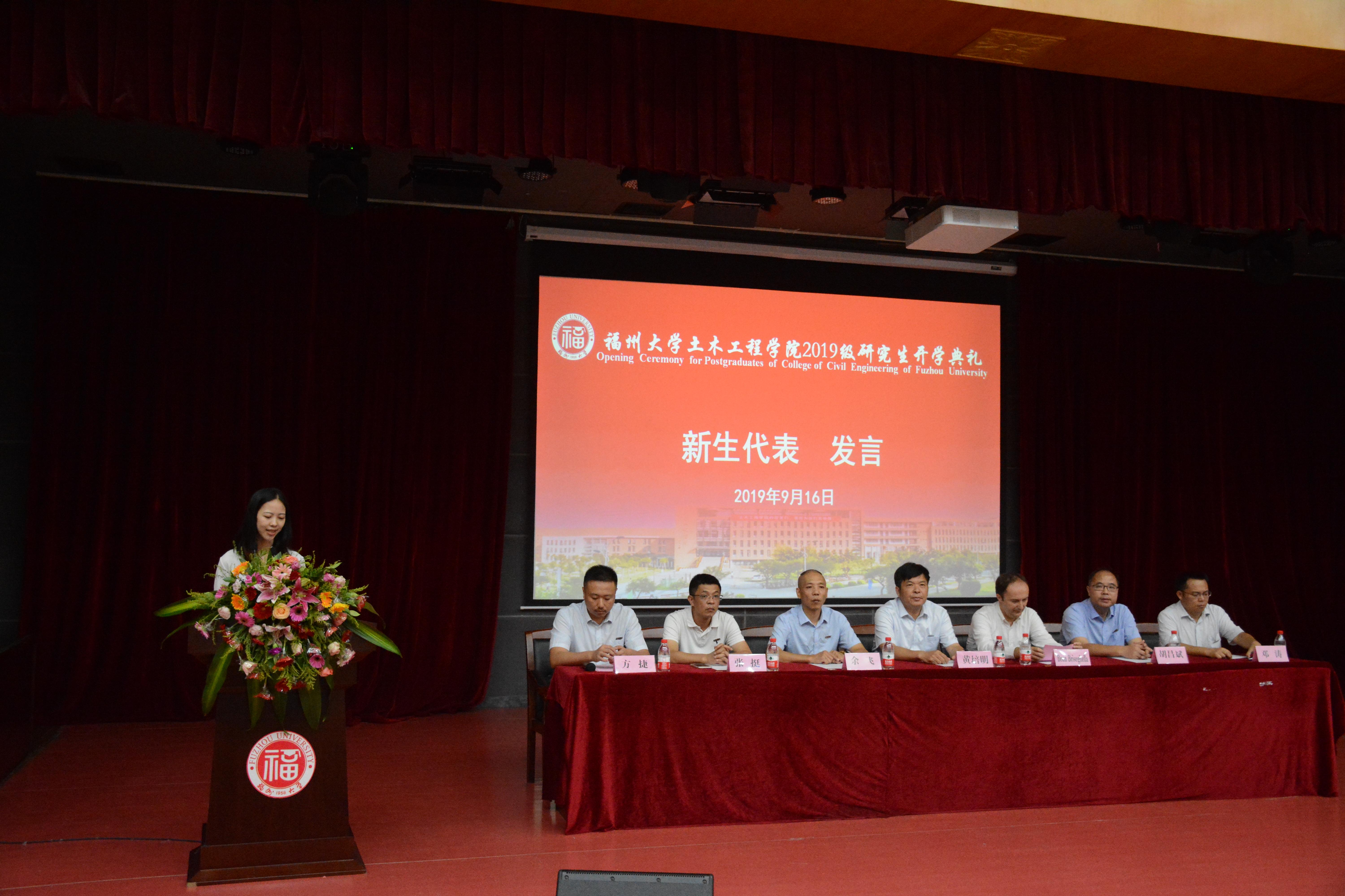 紧接着,由来自交通运输工程专业的研究生新生代表童莹芳同学上台发言,表达了其身为福大土木人的自豪之感。她说,“身为2019级研究生,我们都站在新的起点,面向更广阔的舞台,也面临着更多元的挑战。”,“要坚持心中有梦,敢于追梦;不忘初心,脚踏实地;乐观进取,阳光向上”并以此与新同学共勉。