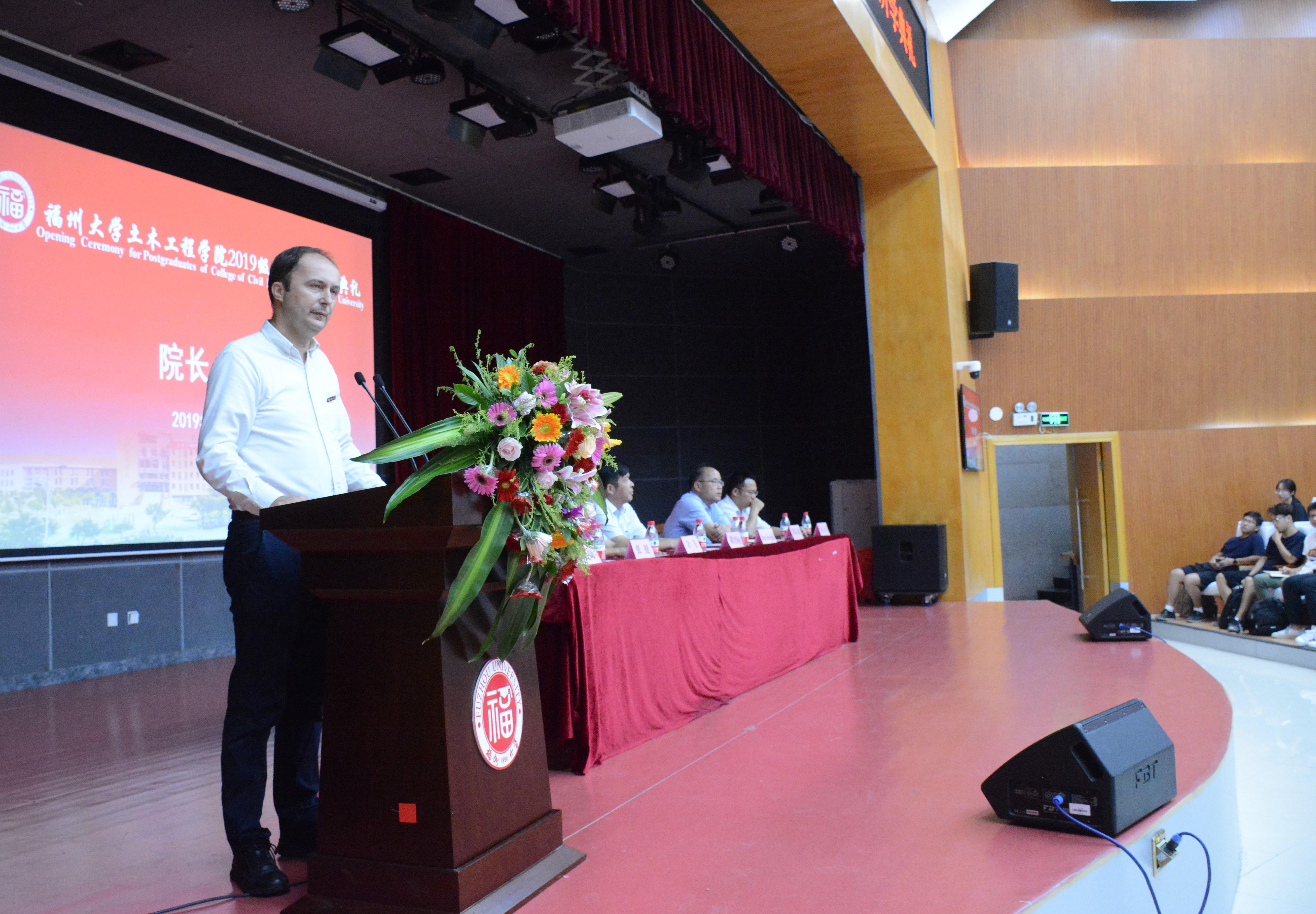 院长布鲁诺教授在典礼中致辞,对2019级研究生表示热烈欢迎并对其提出了几点希望,一是求是创新、知行合一;二是格物致知、厚德敏行;三是自强弘志、精勤奉献,并鼓励研究生们在今后的学习和生活中时刻牢记“明德至诚、博学远志”的校训和绅士漫画