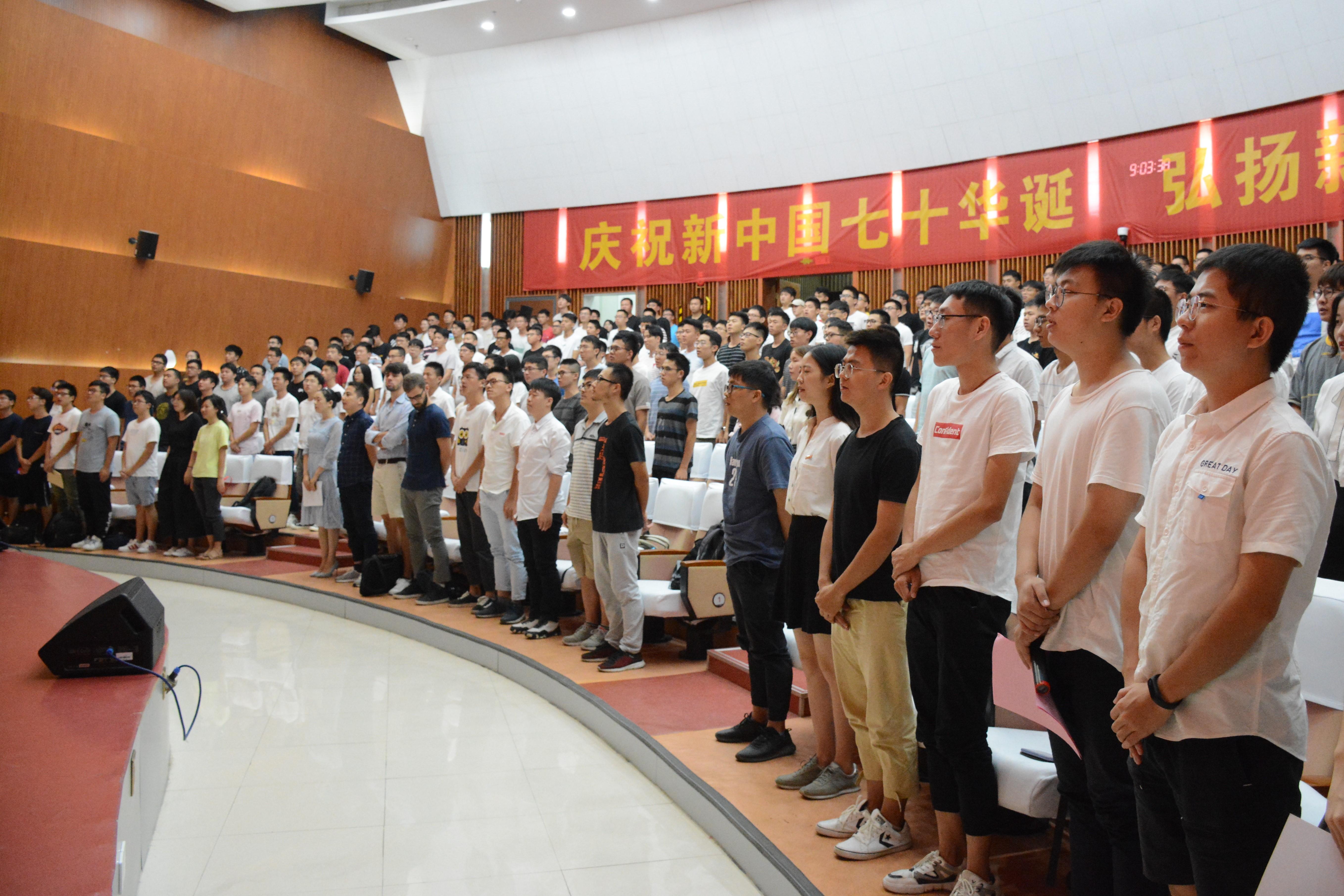 典礼上,当主持人宣布开始后,全体人员起立奏唱国歌。歌声激荡人心,传递着2019级全体研究生对于处在这个伟大时代的强烈自豪感和爱国情。