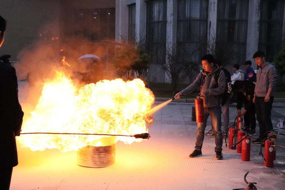 讲座结束后,张洪业教官带领学院师生在模拟火灾现场实地演示了灭火器的正确使用方法,并让同学们亲自参与灭火,亲身体验灭火器使用。
