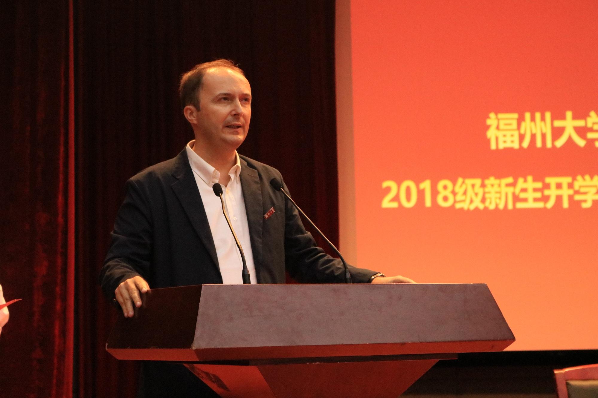 随后本科新生代表吴汉兮同学、教师代表黄梅萍副教授先后上台发言;最后Bruno院长致辞,他代表学院对获得年度先进集体和个人表示祝贺,并对学院2018级849名新生的到来表示热烈的欢迎。他在致辞中对新生提出三点希望,一是要心怀梦想,执着追求;二是要勤于钻研,独立思考;三是要提升格局,开阔视野。并祝愿同学们在未来的大学生活中学习知识、培养能力、提高素质,成为“有梦想、有本领、有作为”的一流人才。