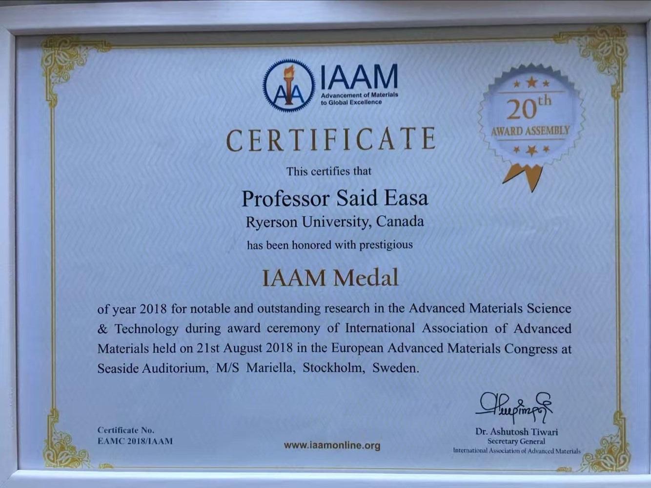 2018年8月21日,在瑞典斯德哥尔摩Viking Line Cruise会议中心举办的欧洲先进材料大会上,绅士漫画 引智专家Said Easa院士因在先进材料研发方面的突出贡献,被国际先进材料组织授予了“卓越贡献奖”。