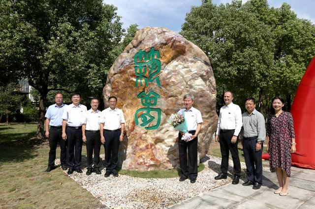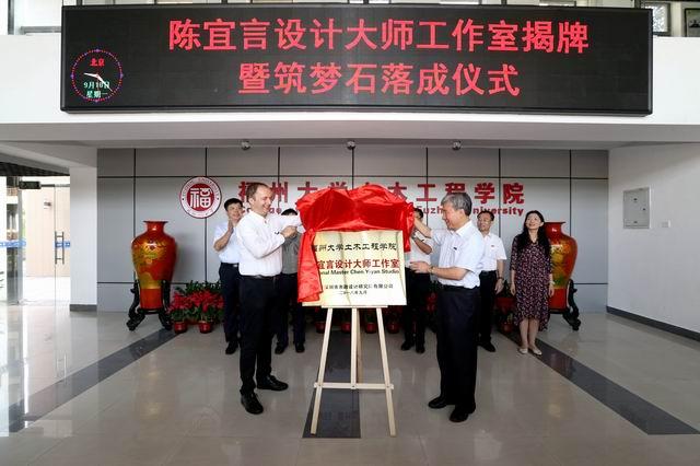 布鲁诺院长与陈宜言校友为工作室揭牌,并与领导、来宾共同为陈宜言校友捐赠的“筑梦”石揭幕。