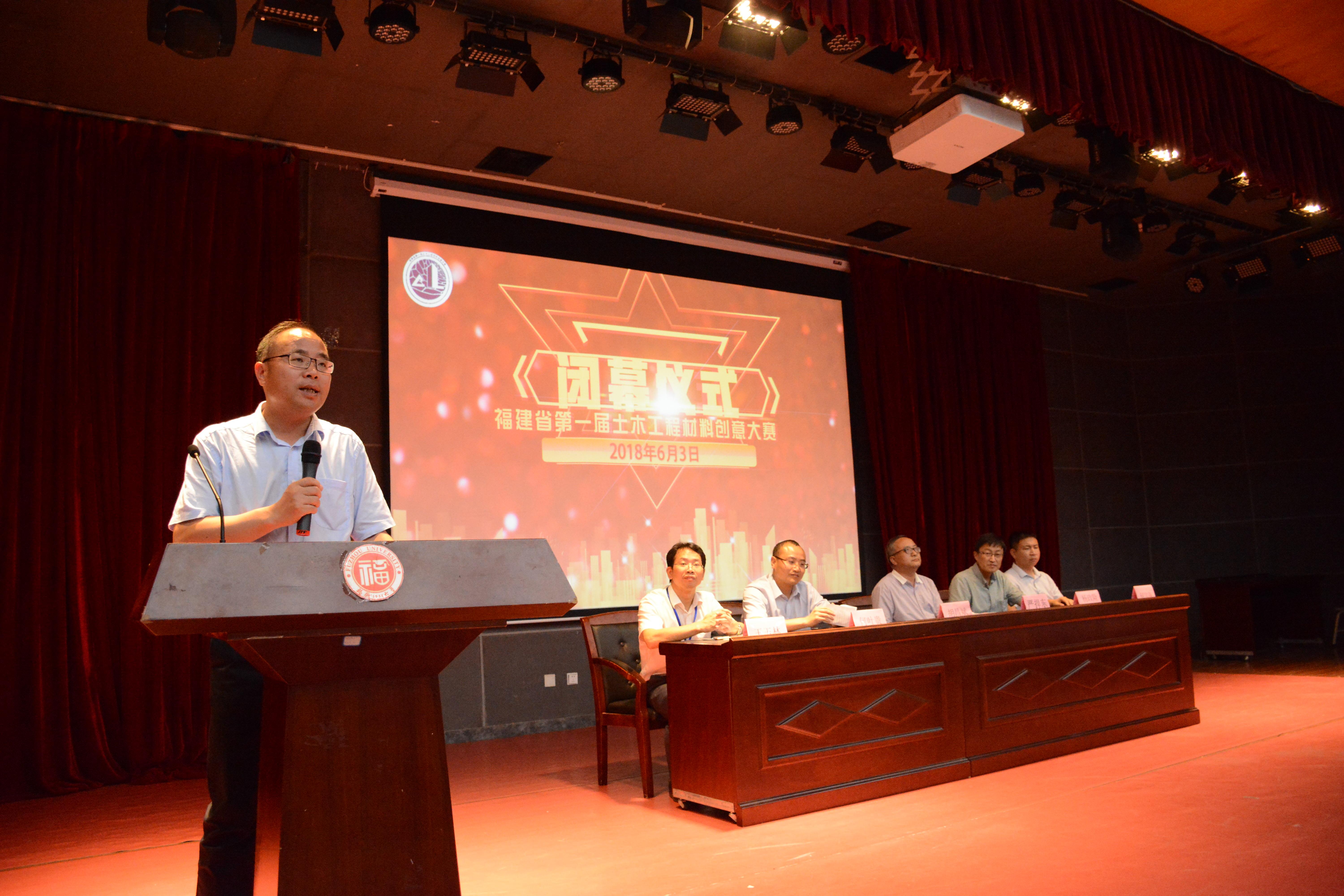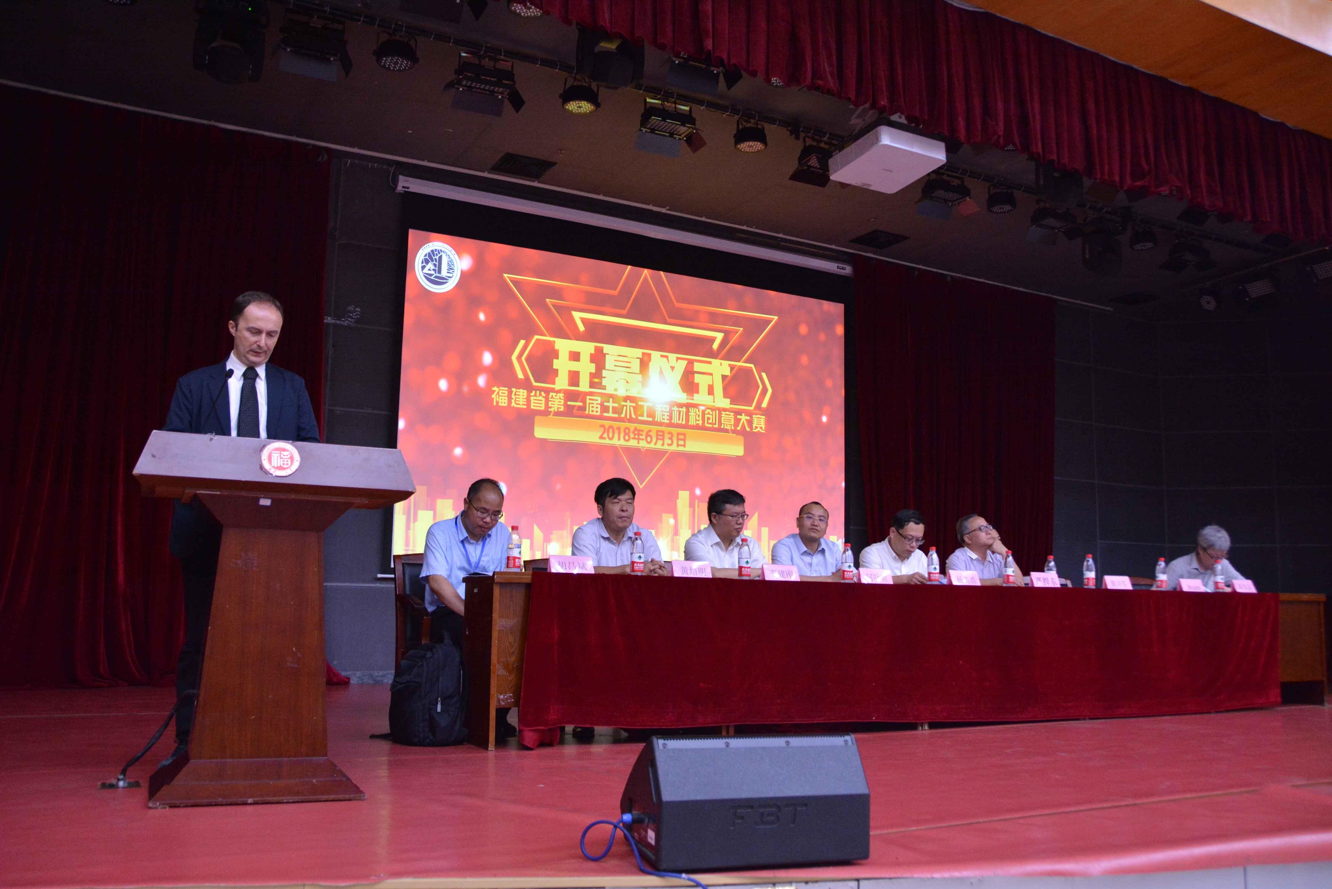 党委常委、副校长杨黄浩代表主办方致欢迎词,福建省土木建筑学会副会长严捍东教授和支持单位鸿生集团代表何叶贵总工程师分别致开幕词,介绍了本次大赛“绿色·生态·创新·中国风”的主题、“展示与发挥土木工程材料在性能、功能、工艺、文化等方面的开发与应用潜力”的目的。开幕式的最后,布鲁诺院长代表承办方致辞,并希望参加比赛的同学们为国家的土木工程的发展做出自己的贡献。