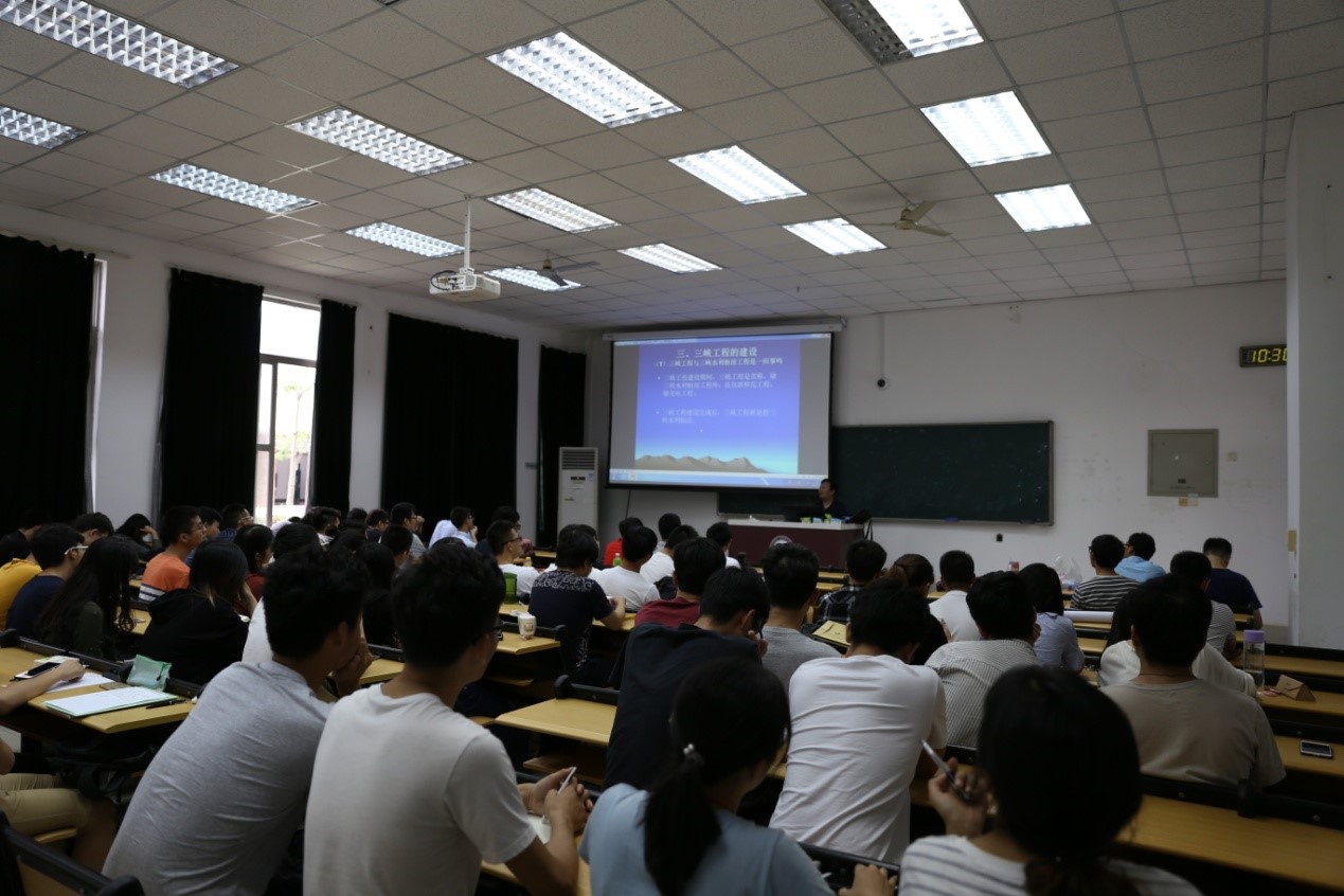 嵇教授有三峡工程、葛洲坝工程一线丰富的工程实践经验,他直观形象的为我们阐述三峡工程的历史和现在,从孙中山先生对三峡工程的设想及新中国各届领导对三峡工程的规划开始,简介了三峡工程的历史由来,详细讲述了三峡建设团队由1984年建成,到1992年三峡项目得到人大会议通过,八年历程中不断破除困难的往事后,让我们了解了三峡水利梦实现的艰辛。同时介绍了三峡工程规模、环境、移民、国家政策、五级船闸、升船机的建设等内容,让我们在三峡不断克服困难,解决问题的建设之路上,看到了祖国治理洪水、发展经济、改善航运的信心和决心,也了解了中国水利工程设计能力、施工技术的高速发展,大家无不对这一宏伟工程的建成感到振奋。嵇教授还与全体师生展开了积极互动,对大家提出的移民生活质量的保障、淤沙处理、军事威胁、环境影响等问题进行了详细讲解,全场气氛活跃。大家为嵇教授全身心投入水利事业的精神所感动,也对水利工作者这一崇高的职业感到自豪。