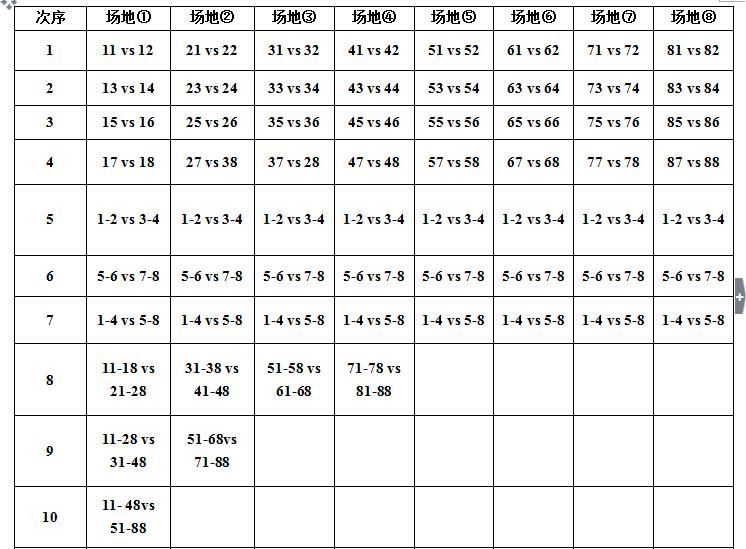 注:1.场地1-8为比赛场地,场地9 -11为热身和练习场地。