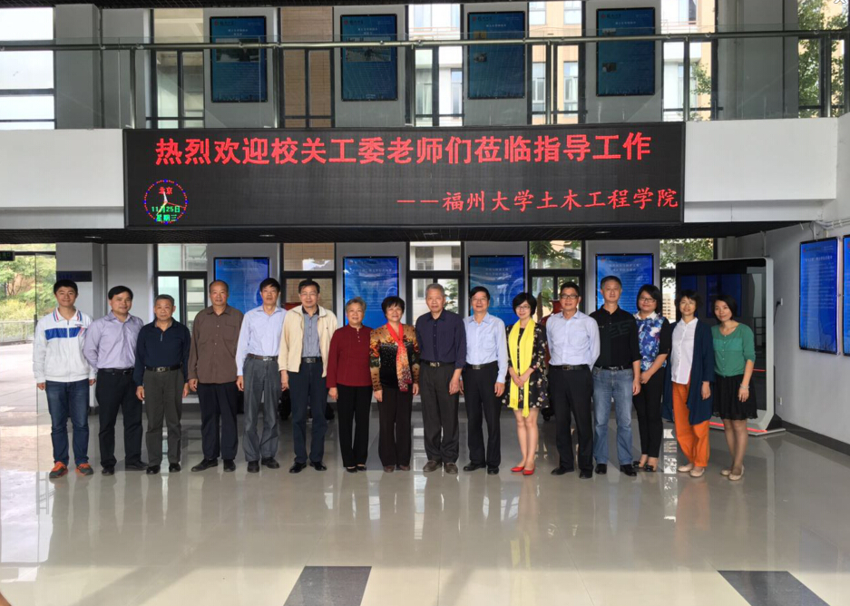 2015年11月25日上午,校关工委老师到土木学院进行考察。考察领导包括有:校关工委常务副主任许亚明,校关工委委员陈燊、俞建长、唐莺、徐拱璧、聂德贤、陈功瑞,校团委副书记黄滨,校关工委张晶;院党委书记张和秋,院关工委主任陈德铭,院关工委委员钱升、陈启丰、陈秋兰、徐剑等陪同此处考察。