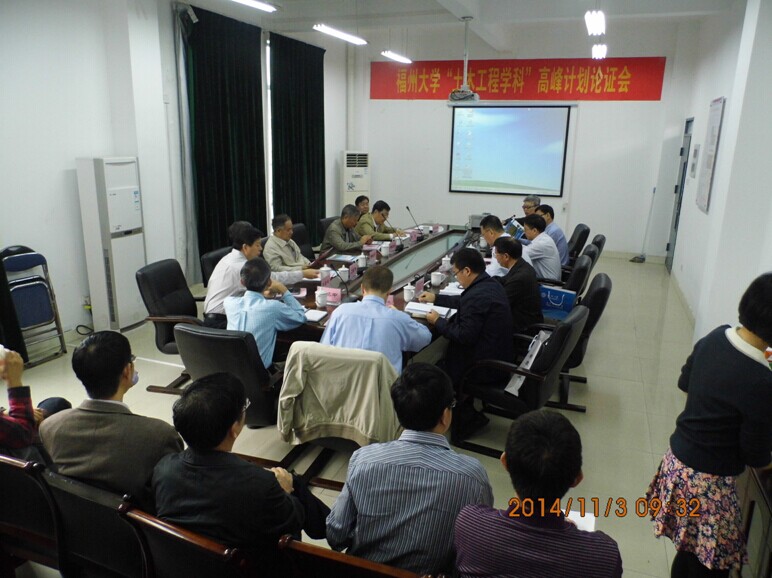 于土木学院结构馆206会议室召开“土木工程学科”高峰计划论证会。为加快推进我校高水平大学建设步伐,提高我校学科建设水平,特邀广州大学周福霖院士、湖南大学陈政清教授、哈尔滨工业大学郑文忠教授、北京工业大学薛素铎教授、东南大学黄侨教授、同济大学黄宏伟教授、美国韦恩州立大学吴怀中教授参与检查指导工作。副校长陈国龙、发展规划与“211工程”办公室、人事处、科技处、对外合作与交流处、土木学院领导及教授等40余人也应邀参会。