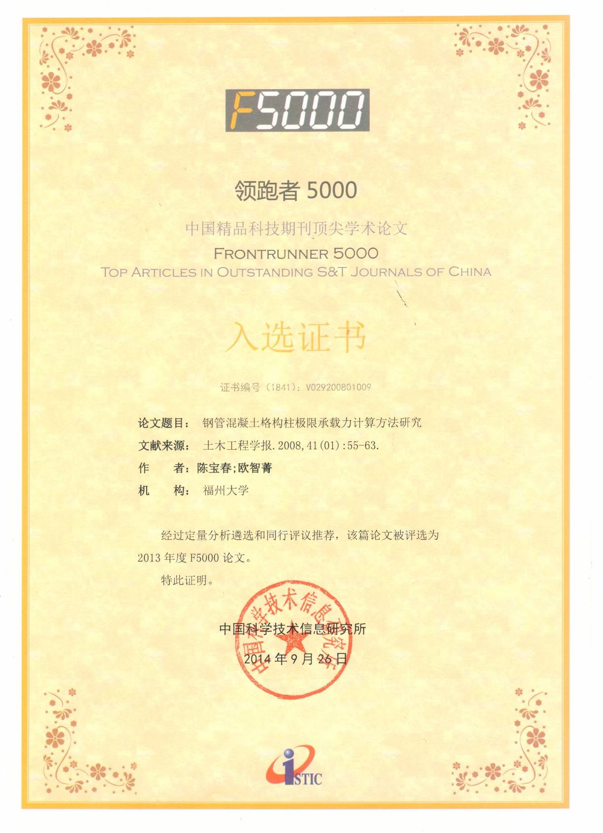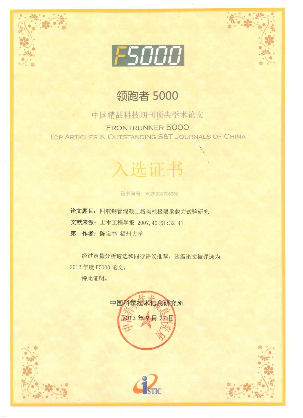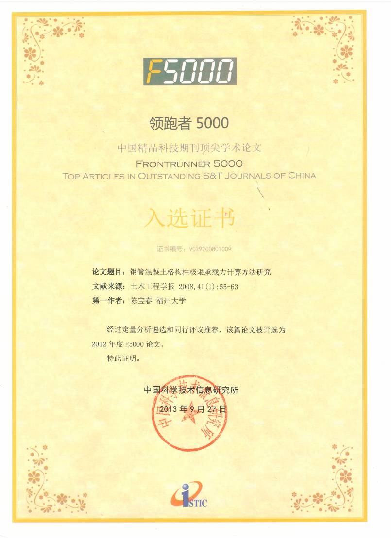 陈宝春教授入选的论文分别是:2007年发表在《土木工程学报》的《四肢钢管混凝土格构柱试验研究》入选2012年F5000,2008年发表在《土木工程学报》的《钢管混凝土格构柱极限承载力计算方法研究》入选2012年F5000和2013年F5000。