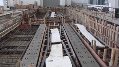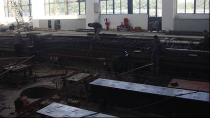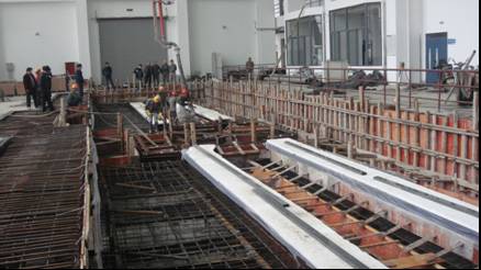 振动台三台阵系统设备基础重3500吨,已于今年10月份完成了前三层混凝土的施工工作。按照施工进度,反力基础将十一月开始第四层也即最后一层混凝土的施工工作。该层混凝土预埋件多,施工难度大,尤其是大、小工字钢梁导轨的安装,其中,小导轨的精度要求为1mm,而大工字钢梁导轨的设计精度要求水平度达到每3延米0.3mm,实际安装过程要求达到每3延米0.1mm,表面光洁度要求达到3微米,该导轨的精度要求是目前我国高速铁路精度(1mm,与小导轨相若)的上十倍。经过相关各方的努力,目前已基本达到了设计要求的0.1mm/3m,同时在反力基础30m范围内的任何一点的水平度不超过0.3mm,因此,基本上可以认为该平面为绝对水平。
