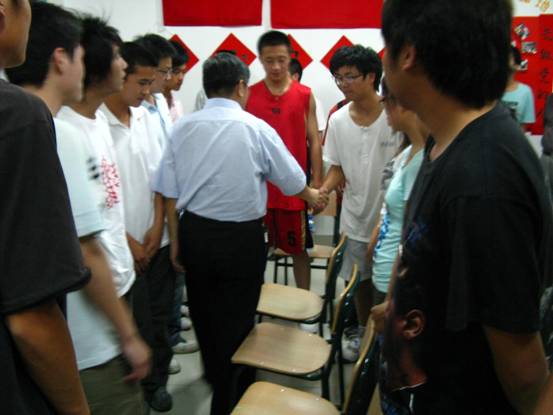 08级学生余仕兵握手