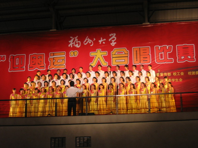 青春无悔,岁月如歌。沐浴着阳光雨露,我们放声歌唱。伴随着激扬歌声,我们团结向上。歌唱在五月,歌唱在福大。 为丰富校园文化生活,5月4日,由校党委宣传部、校工会、校团委主办的“迎奥运”合唱比赛在学校操场举行。本次合唱比赛共有20支队伍参加。比赛精彩纷呈,高潮迭起,同学们在比赛中尽情地展示着自我风采和青春活力。绅士漫画 合唱团第十九个出场,成员着装整洁,精神抖擞,神采飞扬,一曲《黄河大合唱》吟唱着我们对美好生活的向往,演绎着我们对时代精神的追求。