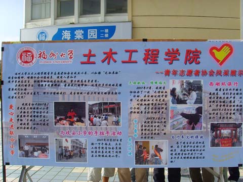 另外,在万人签名、祝福语活动中,各学院同学在“与志愿携手,与奥运同行”横幅上签上自己的名字,写上对灾区人民,北京奥运,08年的多灾中国的深深祝福,也成为本次风采展的一道亮丽的风采。