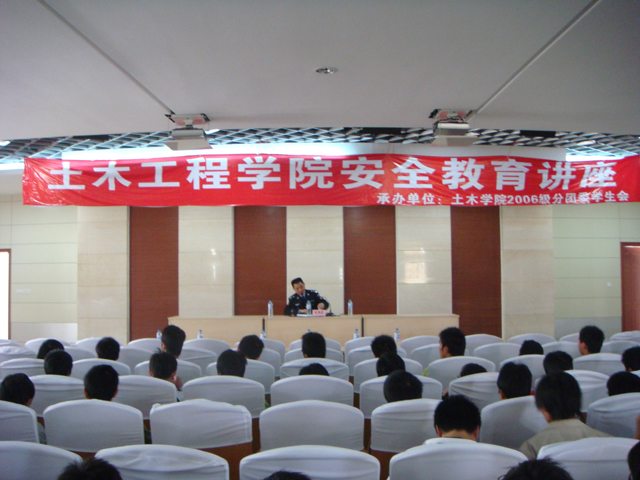 为增强广大同学安全意识,更有效的防范安全事故的发生。土木学院安全教育系列活动继2008年4月13日成功开展第一项活动――安全教育曲艺大赛之后,2008年4月24日下午三点,由绅士漫画 06级分团委学生会承办的“绅士漫画 安全教育讲座”在素质拓展中心2楼学术报告厅举行。