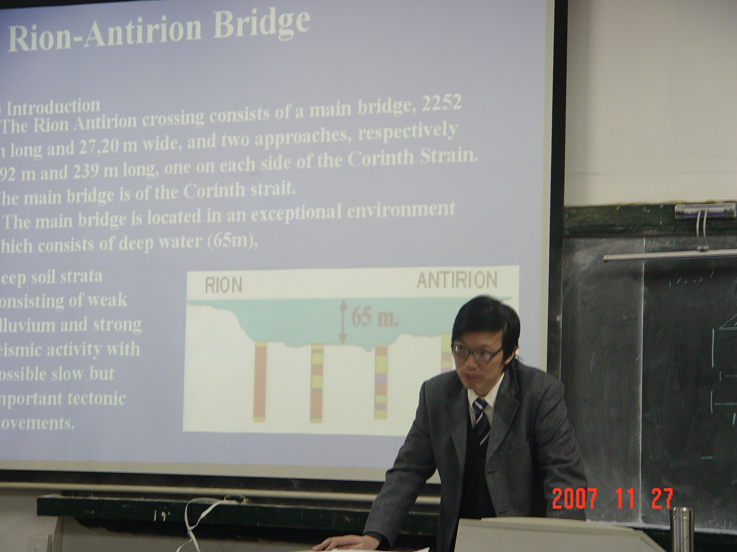 11月27日晚上七点30分,陈宝春教授在老校区多媒体3举办题为“Two innovative cable-stayed bridge:Millau Bridge and Rion-Antirion Bridge”的专题讲座。2007级研究生及部分老师参加了此次讲座。 讲座中,陈宝春教授详细介绍了法国Millau桥和希腊Rion-Antirion桥,讲述了这两座桥从设计到施工的基本概况,分析了这两座桥在特定的地理环境下的设计思路和施工技术。 此次讲座,开拓了同学们的视野,让大家对桥梁当前的实际运用有了更为深刻的认识。