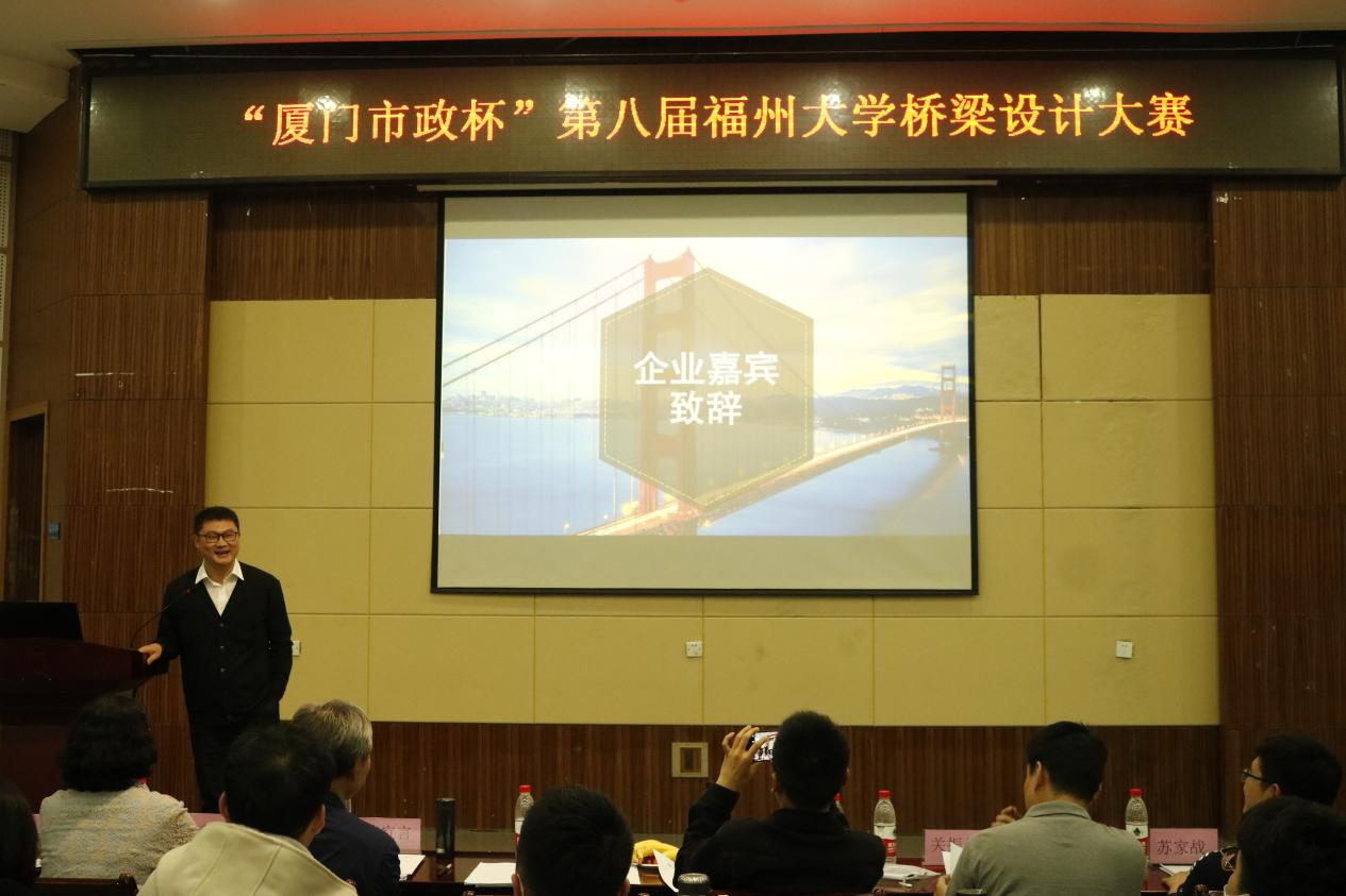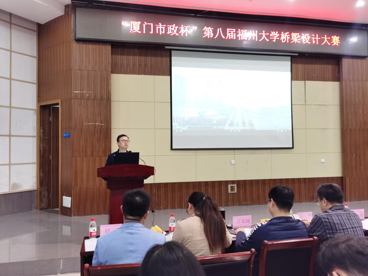 比赛尾声,厦门市市政工程设计院有限公司李贞治副总经理从自身的学习经历,讲述了福大桥梁专业的历史,并寄语母校桥梁专业发展越来越好,桥梁大赛越办越好!并对本次的参赛作品和参赛选手表示高度认可,同时鼓励学弟学妹们大胆创新,多创作一些地标性桥梁建筑。大赛一等奖团队成员代表张恒、潘迦南分别从设计选题、团队协作、参赛经验、导师指导、参赛平台等多个角度做参赛经验分享。最后由陈宜言大师致闭幕词,他着重讲述了原创性设计的重要性,鼓励地标性建筑的设计,同时强调了汇报答辩时陈述表达能力的重要性!并寄语福大学子在桥梁建设中大放光彩!