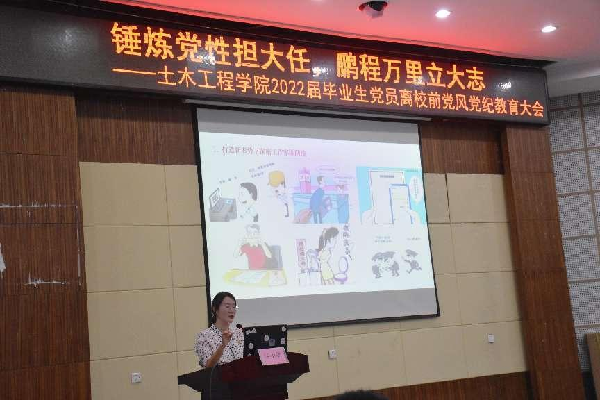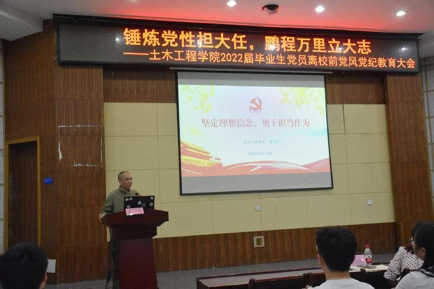 院党委副书记余飞以“坚定理想信念,勇于担当作为”为主题,给在座的毕业生党员上深刻的党课。他勉励党员要朝着将学校建设为更高水平的“双一流”高校、打开海内外知名度而努力;他提醒党员要继续加强理论学习,独立思考、学用结合,在党的二十大召开之际,将个人选择与国家、社会命运相结合;他号召党员要牢记使命,发挥先锋模范作用、全面深刻考虑问题,在大是大非面前必须保持政治定力。并对党员们提出了突出以身作则、突出关键少数、突出搭桥接路等要求。最后,他为大家送上“韶华永熠,未来可期”的祝福,希望土木学子能够守正创新、匠心筑梦,为中国建设贡献力量。