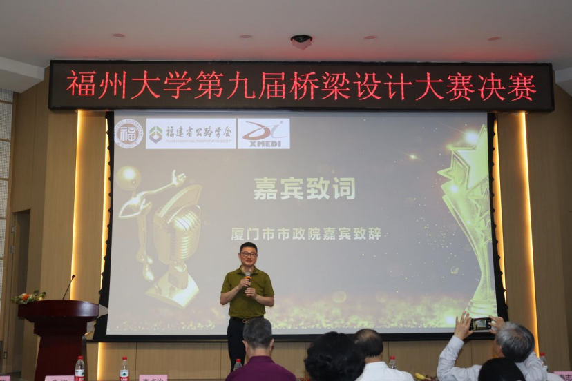 比赛尾声,厦门市市政院副总经理兼设计三院院长李贞治先生为本次比赛致辞,李贞治先生对福大土木学子们的创新与专业发出了由衷的感叹,对本次的参赛作品和参赛选手表示高度认可,同时也表达了出席本次比赛的喜悦之情,寄语学子们能够前程似锦,母校的桥梁专业发展越来越好,桥梁大赛越办越好!