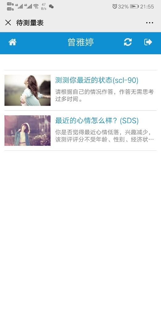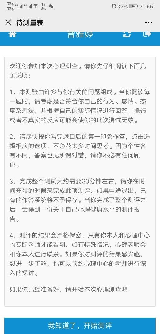 二、登录成功后需要先进行个人信息完善,方可进入测评说明界面,仔细阅读说明后点击开始测评,可见scl-90及SDS两份待测量表。