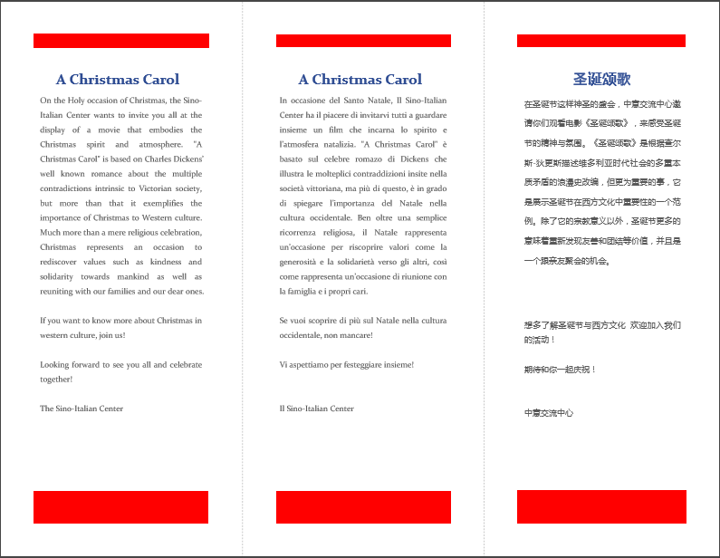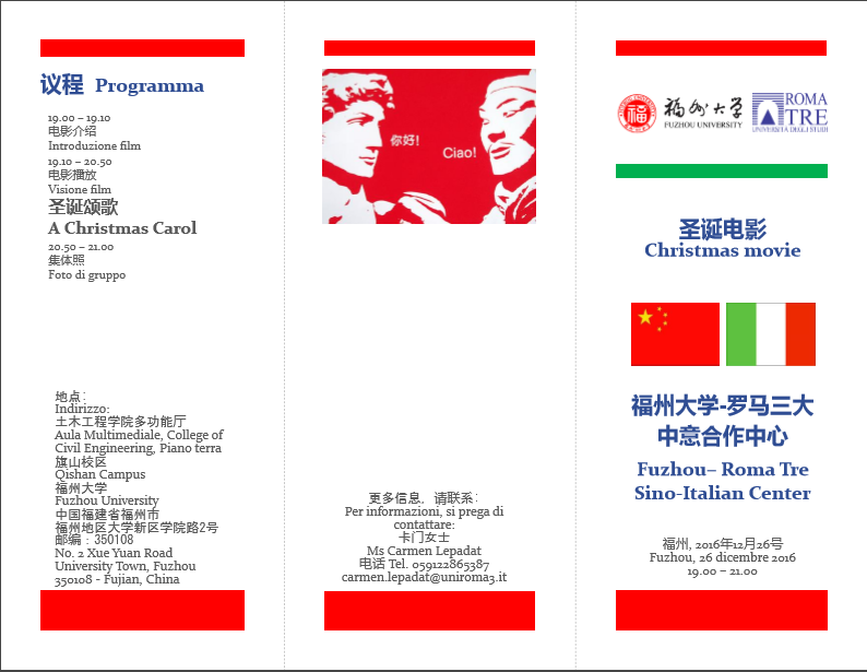 在这一年一度的圣诞之余,将邀请意大利的留学生们和福大的学子们一起观看电影《圣诞颂歌》,让同学们在沉浸圣诞节的快乐之余,更能了解西方传统文化以及体会圣诞节的魅力。同时也祝同学们圣诞快乐,Merry Christmas!