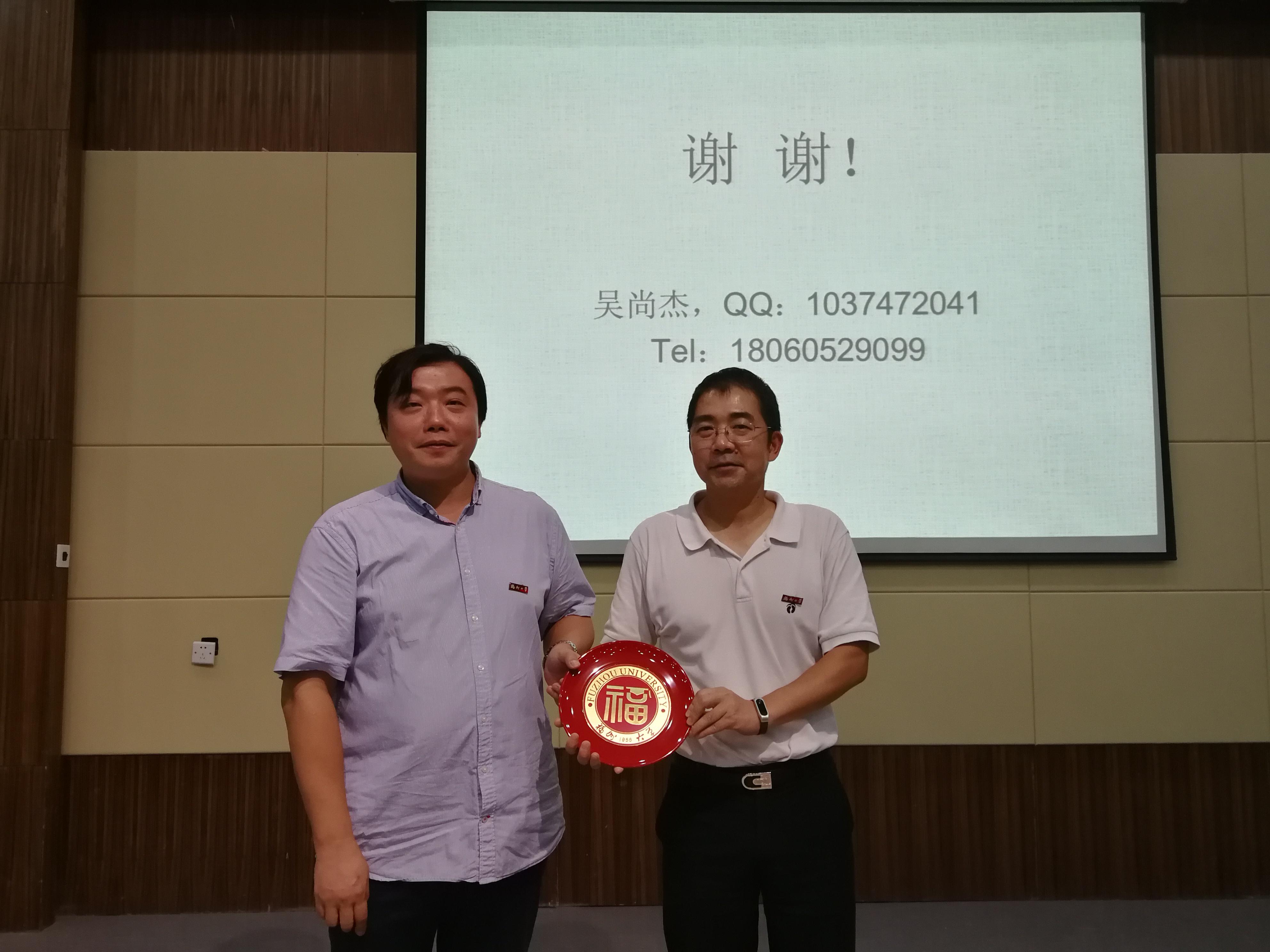 在互动环节,吴尚杰博士介绍了一些国外生活的轶事,回答了大家关心的就业和择业问题。同时,鼓励大家勇敢的走出国门,趁着年轻努力成就一番作为。讲座结束后,吴庆雄研究员向吴尚杰博士致以诚挚的感谢,献上福盘纪念品,并合影留念。
