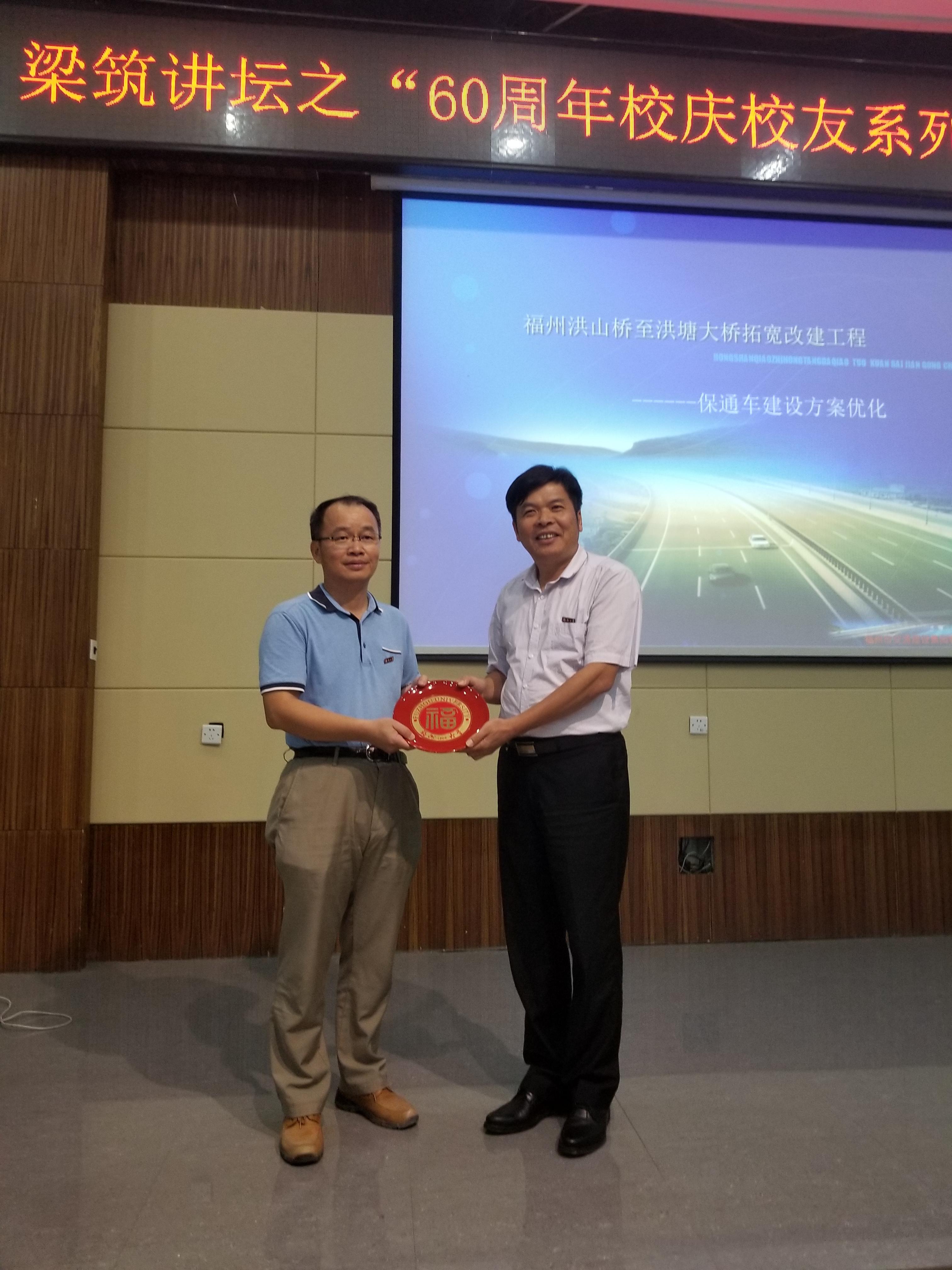 在提问环节,黄朝光高级工程师结合自己22年的工程实践经历耐心地回答了同学们的提问,并鼓励同学在以后的工作过程中,不仅设计的建设方案需要合理可行,节省投资,还要考虑道路周边环境及沿线居民出行条件,切实体现“以人为本”的建设理念,充分提升工程建设的社会效益。讲座结束后,黄培明书记向黄朝光高级工程师致以诚挚的感谢,献上福盘纪念品,并合影留念。
