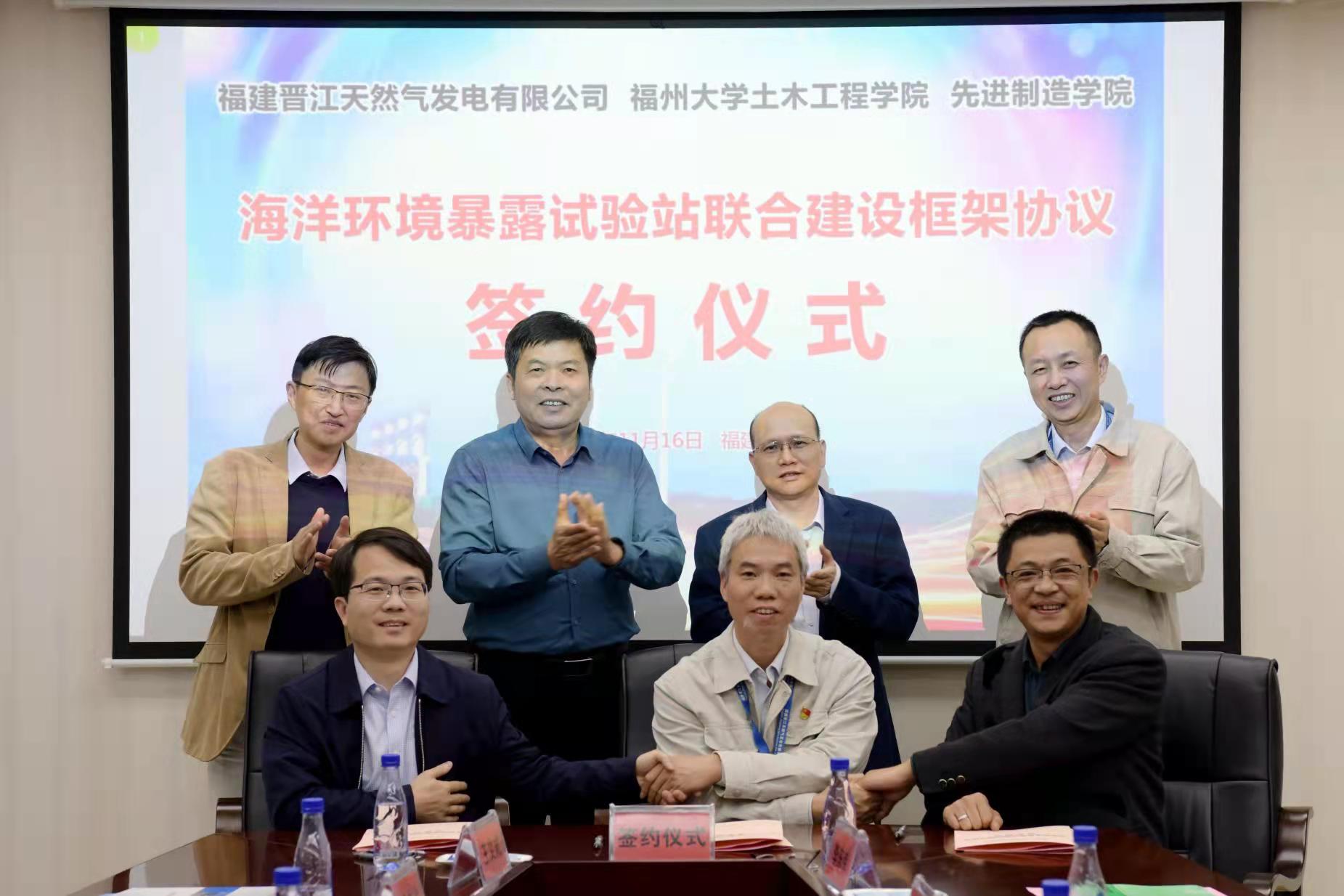 及福大先进制造学院与福建晋江天然气发电有限公司三方签订“海洋环境暴露试验站联合建设框架协议”在晋江气电公司四楼会议室举行。院党委书记黄培明、副院长张挺,福大先进制造学院副院长林志贤,晋江气电公司党委书记、董事长李东妙,党委副书记、总经理罗睿,副总经理钟爱民等院企领导及相关专家、技术骨干代表等参加,仪式由李东妙董事长主持。
