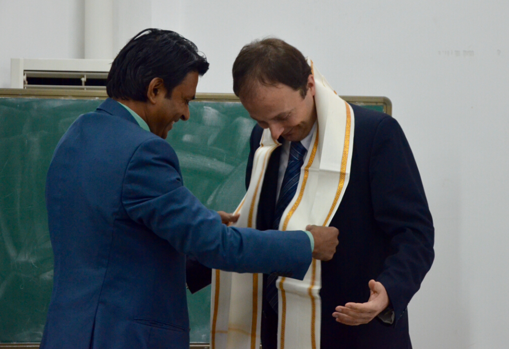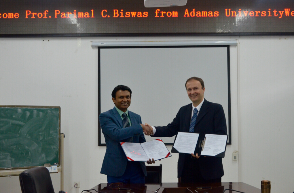 与印度Adamas大学合作框架协议签约仪式。签约仪式初期,双方各自介绍了学院现状,Parimal Chandra Biswas为我们播放了Adamas大学宣传片。继而,双方就人才师资交流的具体细节进行商讨。最后,布鲁诺院长与Parimal Chandra Biswas代表双方签订合作框架协议。