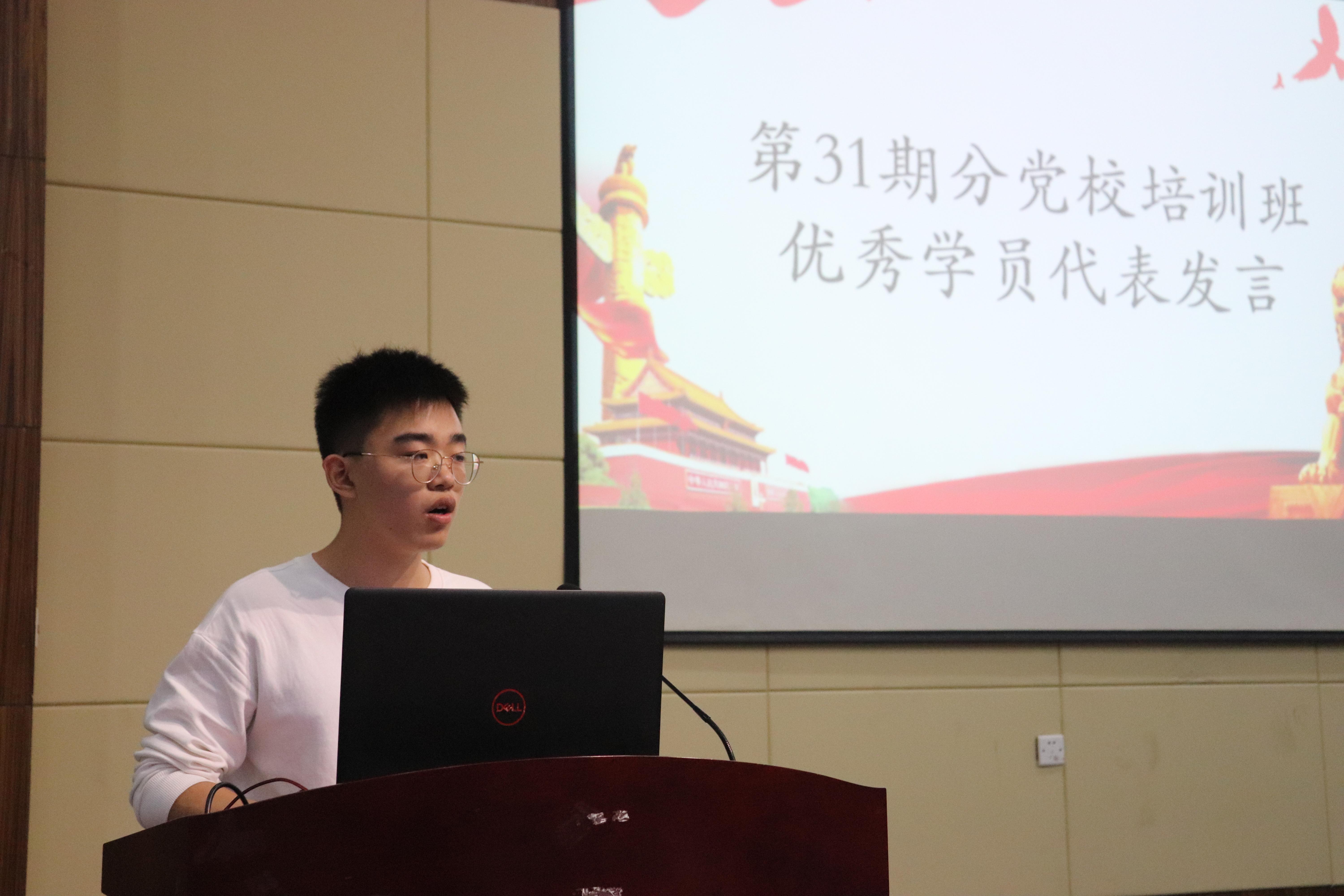 颁奖仪式后,2019级土木工程二班的余文辉同学代表第31期分党校全体结业学员发言。在发言中,他回顾了第31期分党校学习的全过程,畅谈对党员身份的理解,总结分党校学习的收获,分享自己党课学习的三点感悟:一是要不忘初心,牢记使命。将全心全意为人民服务的宗旨融入到今后的学习和生活中。二是要勤学善思,求真笃行。在学习与实践中不断提升自己。三是要服务于民,奋勇争先。积极参加志愿服务,面对困难,奋勇争先。
