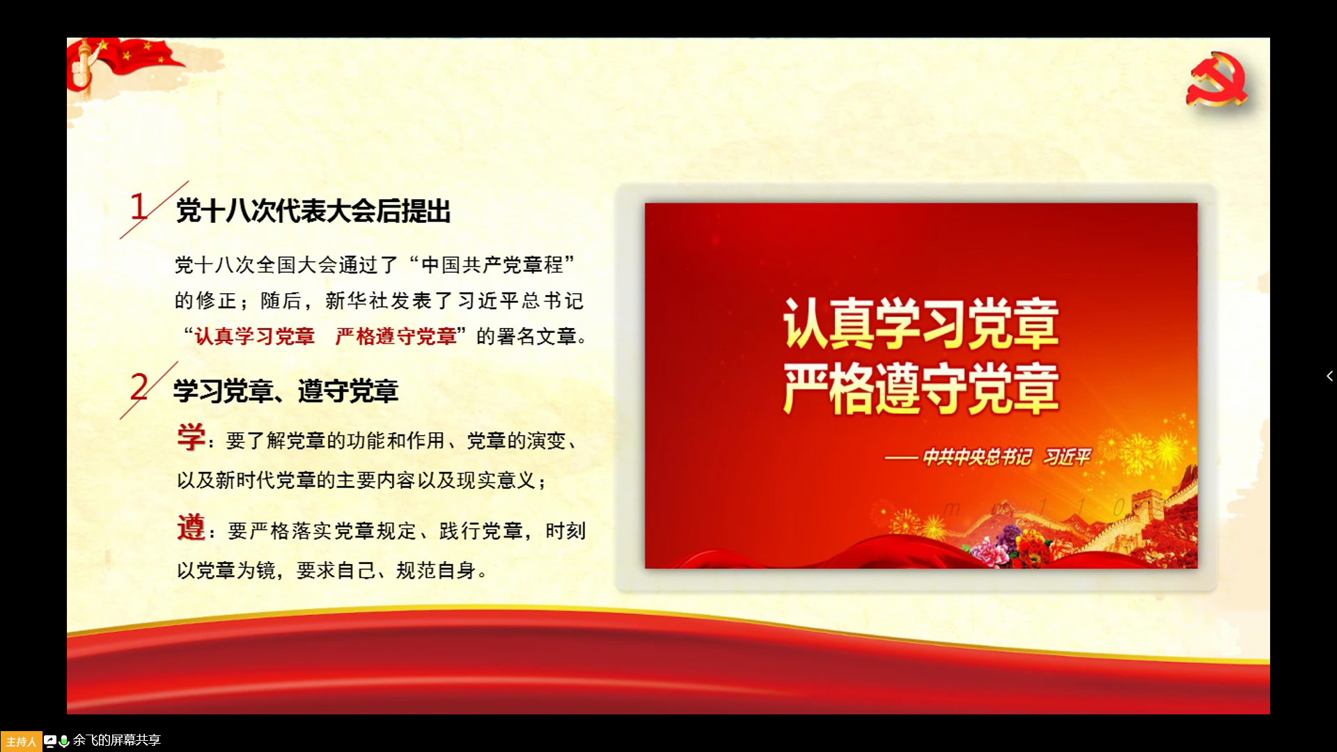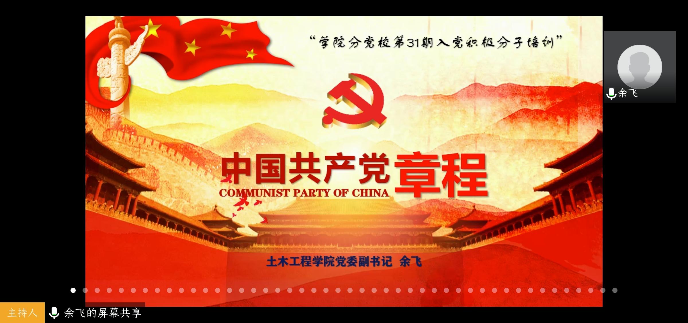 4月10日晚,院第31期入党积极分子培训班第二课于线上进行,学院党委副书记余飞为培训班全体学员解析《中国共产党章程》。