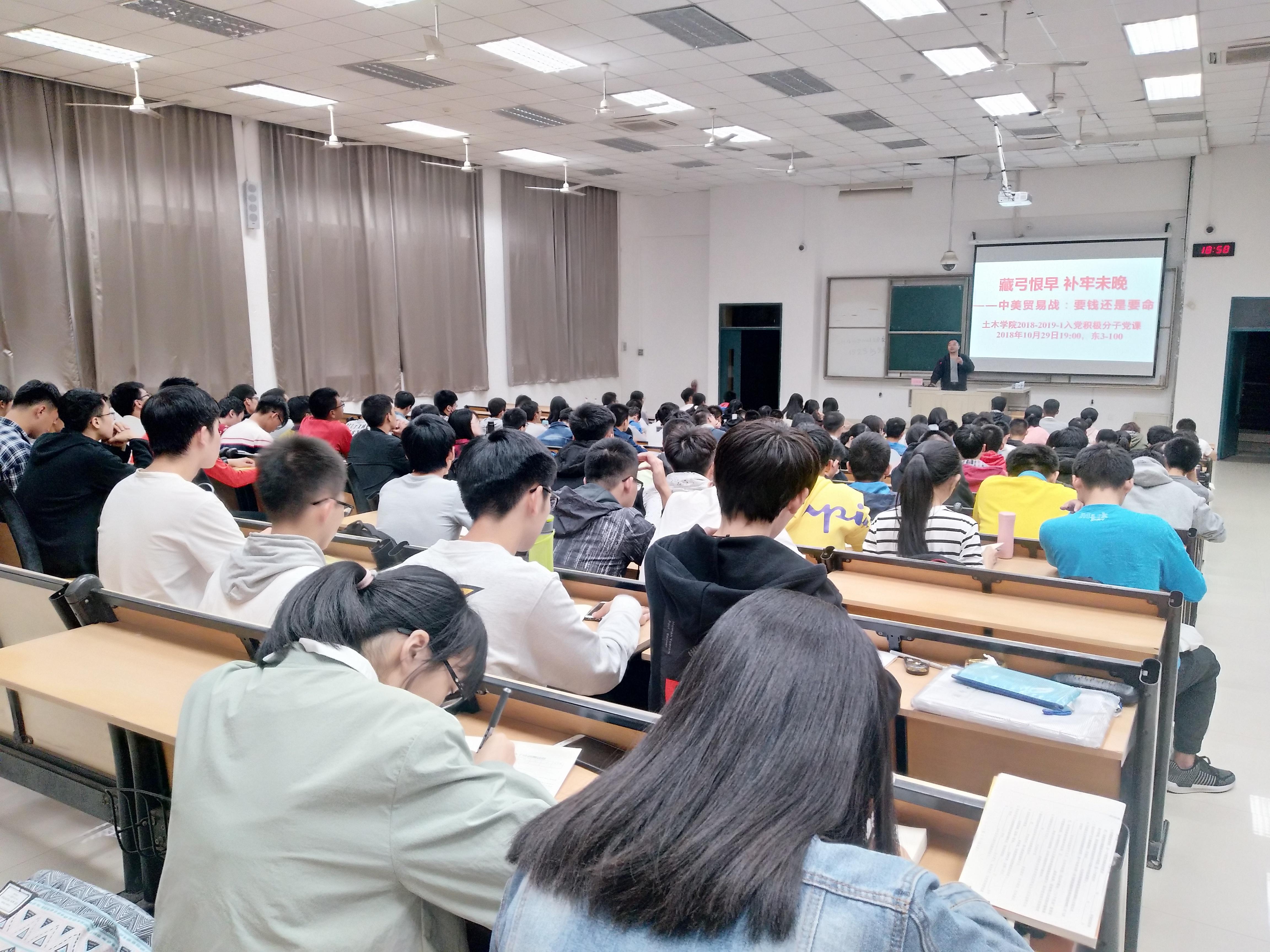 材料学院党委副书记王剑龙为培训班学员上了一堂题为《藏弓恨早 补牢未晚——中美贸易战:要钱还是要命》的专题党课。