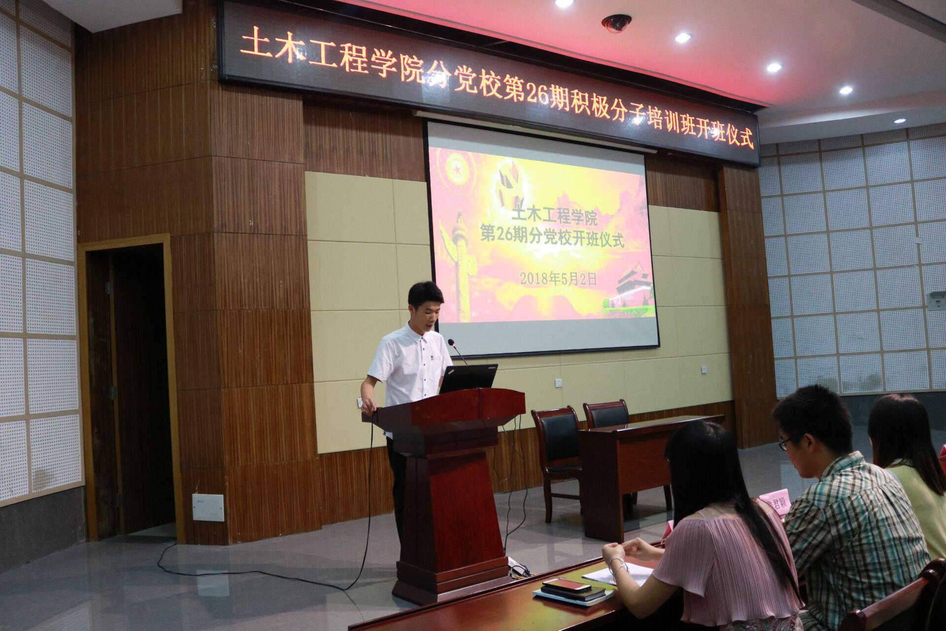 首先,由陈梅凤同志作为主持人宣布开班仪式正式开始,全体起立,奏唱国际歌。接着由2017级水利水电工程一班的李谷源同学代表本期入党积极分子上台发言,他先后阐述了党员的义务与要求,表示了要向党员学习时刻严格要求自己以及努力掌握党的理论知识的决心。紧接着陈梅凤同志宣读培训班纪律要求和考核内容,要求所有入党积极分子要严格遵守。