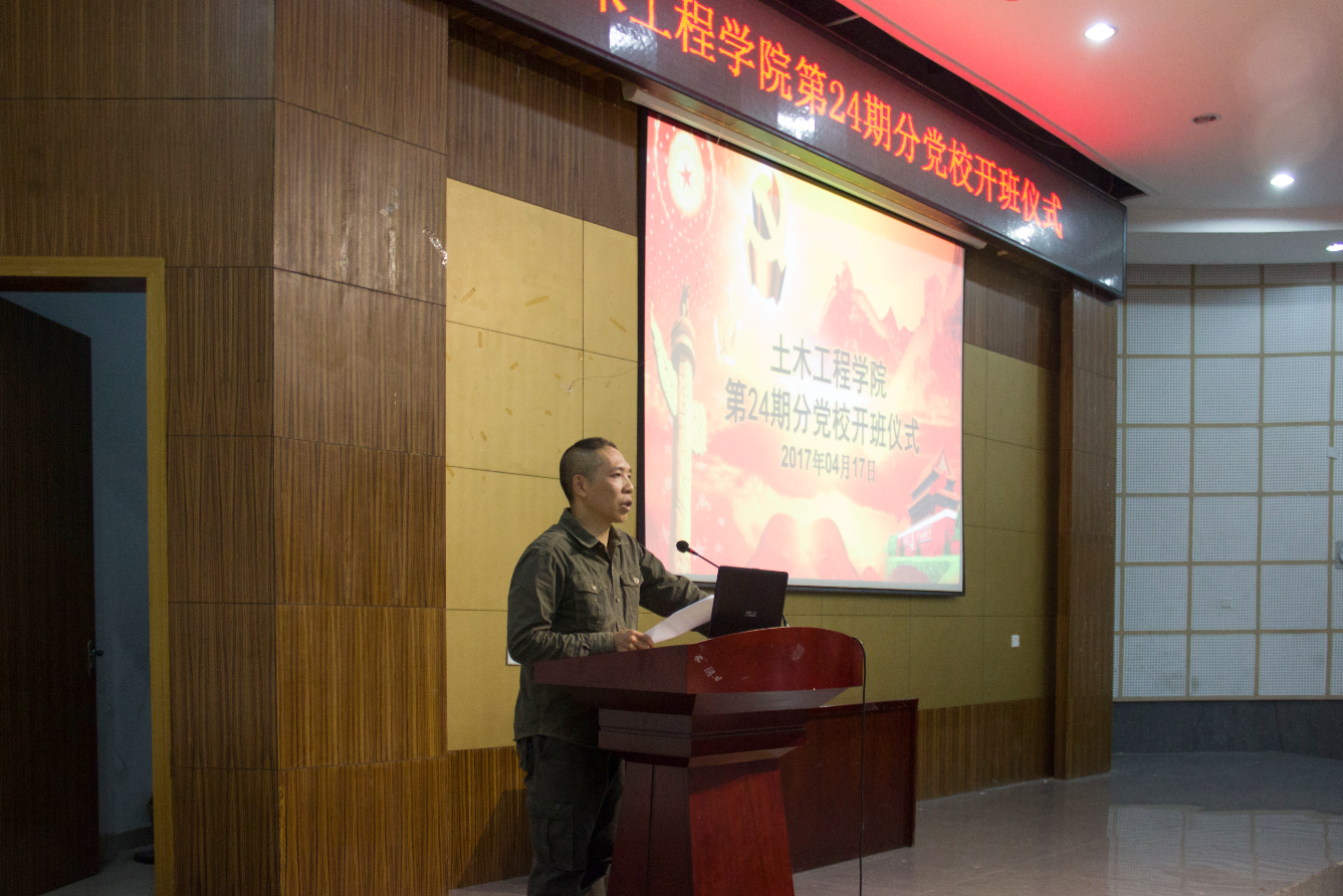 党委副书记余飞、院团委书记许长宾以及各级辅导员。首先由徐剑老师作为主持人宣布开班仪式的开始,全体起立,奏唱国际歌,接着给水与排水工程一班叶鸿宇同学代表本期入党积极分子上台发言,他表示要时刻以社会主义接班人标准严格要求自己,向党员看齐,谨记时代的要求,贡献出自己的力量。随后,徐剑老师宣布此次党校的规章制度,并要求所有入党积极分子严格遵守要求,以党员的标准严格要求自己。